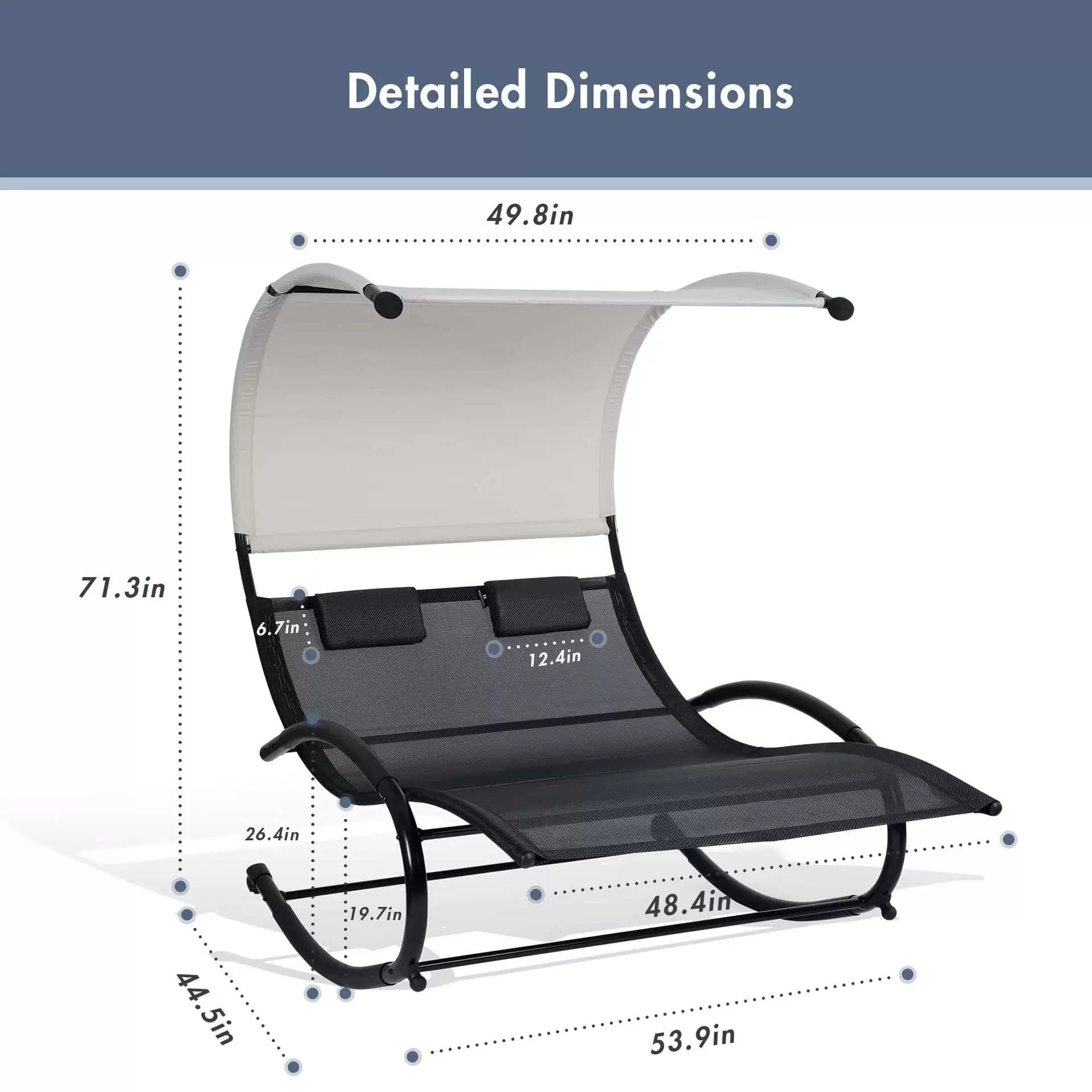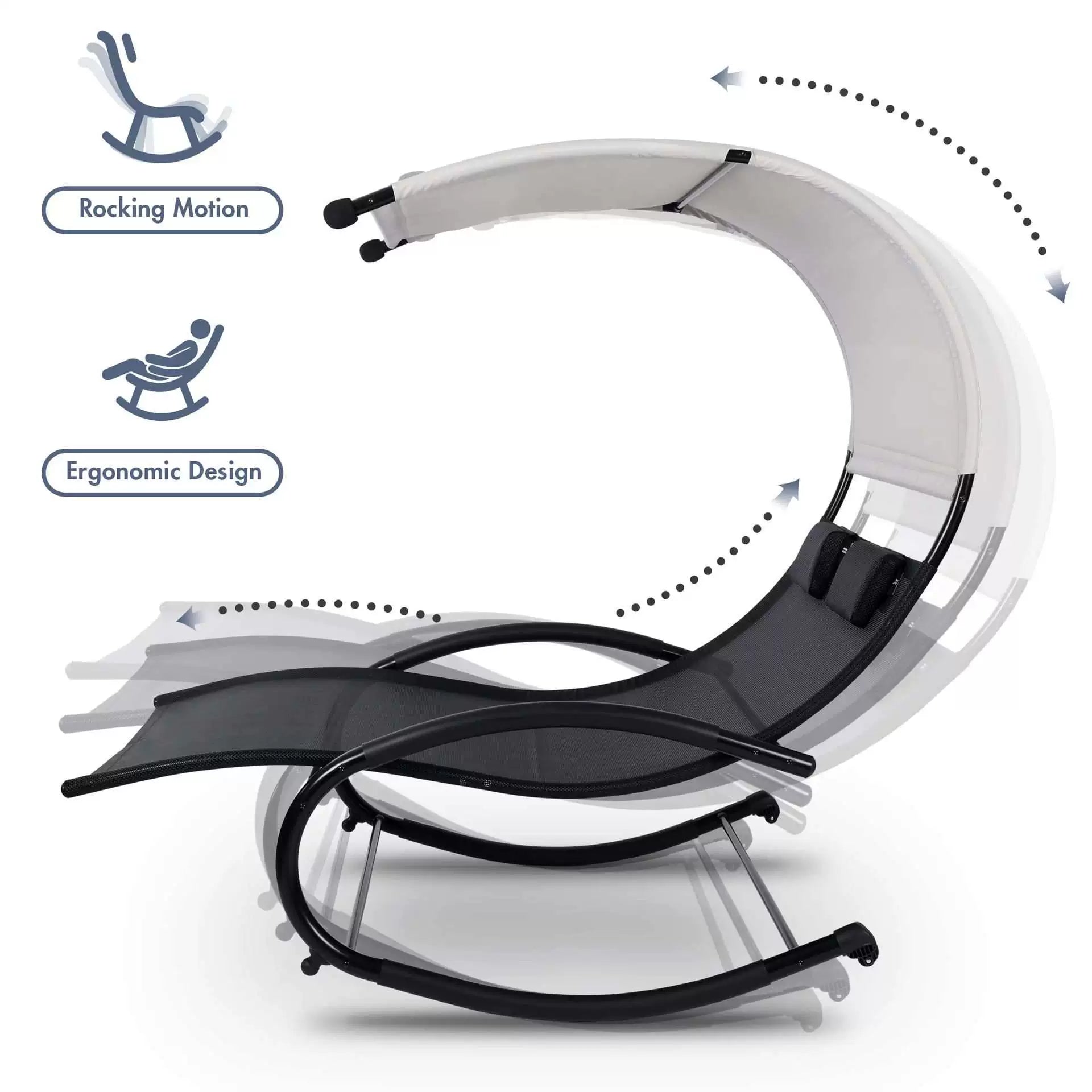 Built for convenience and ease, this double rocking bed includes padded armrests for extra support and comfort, along with a bump protector for added safety. The adjustable sunshade canopy protects you from the sun, while the movable wheels allow you to easily relocate the chair to the perfect spot in your yard, patio, or poolside. Combining durability, style, and practicality, this reclining chair is your go-to solution for ultimate relaxation.