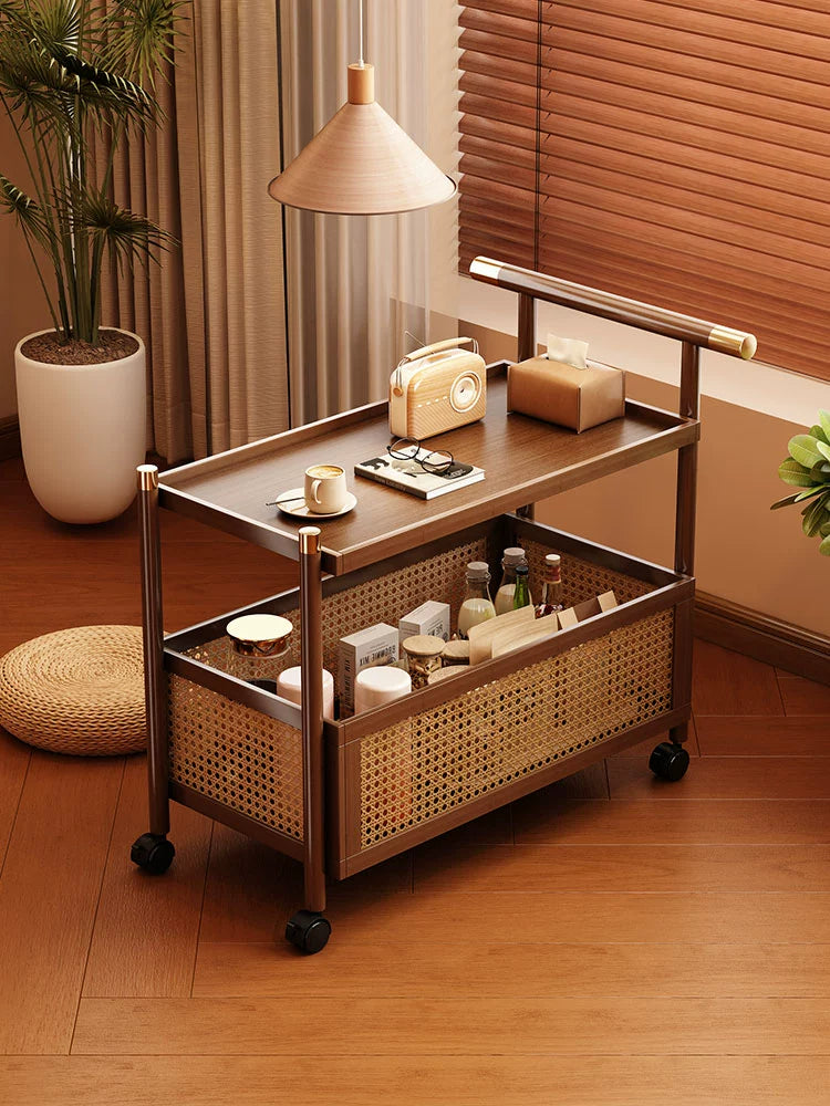 Bring effortless charm and functional design into your space with this 2-Layer Bamboo Trolley Side Table. Crafted from durable solid bamboo and finished in a warm walnut tone, this movable side cabinet blends timeless appeal with modern versatility. Its two-tier structure provides ample storage or display space, perfect for snacks, books, or decor, whether it's beside your bed or next to the sofa.