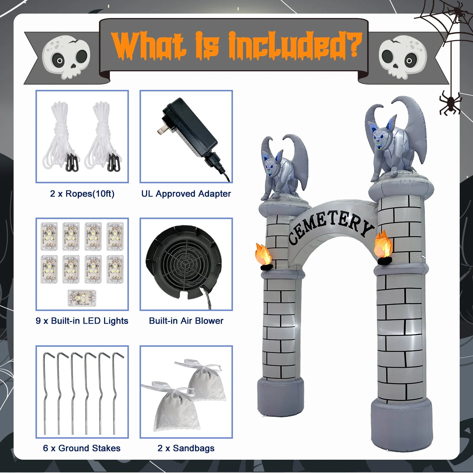 Enhance your Halloween decor with the NNEOBA 10FT Halloween Inflatable Archway. Standing at an impressive 10 feet tall, this giant haunted archway sets the perfect spooky scene for your yard, welcoming trick-or-treaters and party guests alike. With built-in LED lights for a glowing effect at night, it’s sure to catch attention. The inflatable is easy to set up, featuring a built-in fan, 6 ground stakes, and 2 sandbags for secure installation. Plus, the UL-approved plug with a 106-inch power cord ensures convenient setup without needing an extension cord. Perfect for outdoor Halloween displays, this durable inflatable arch adds a fun, eerie touch to your festive decorations.