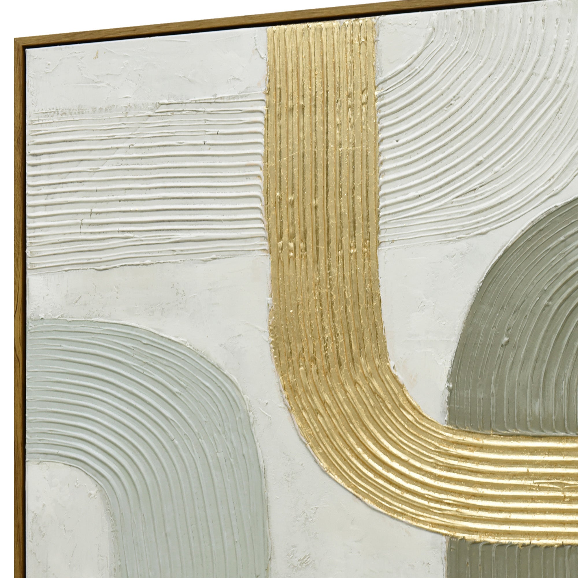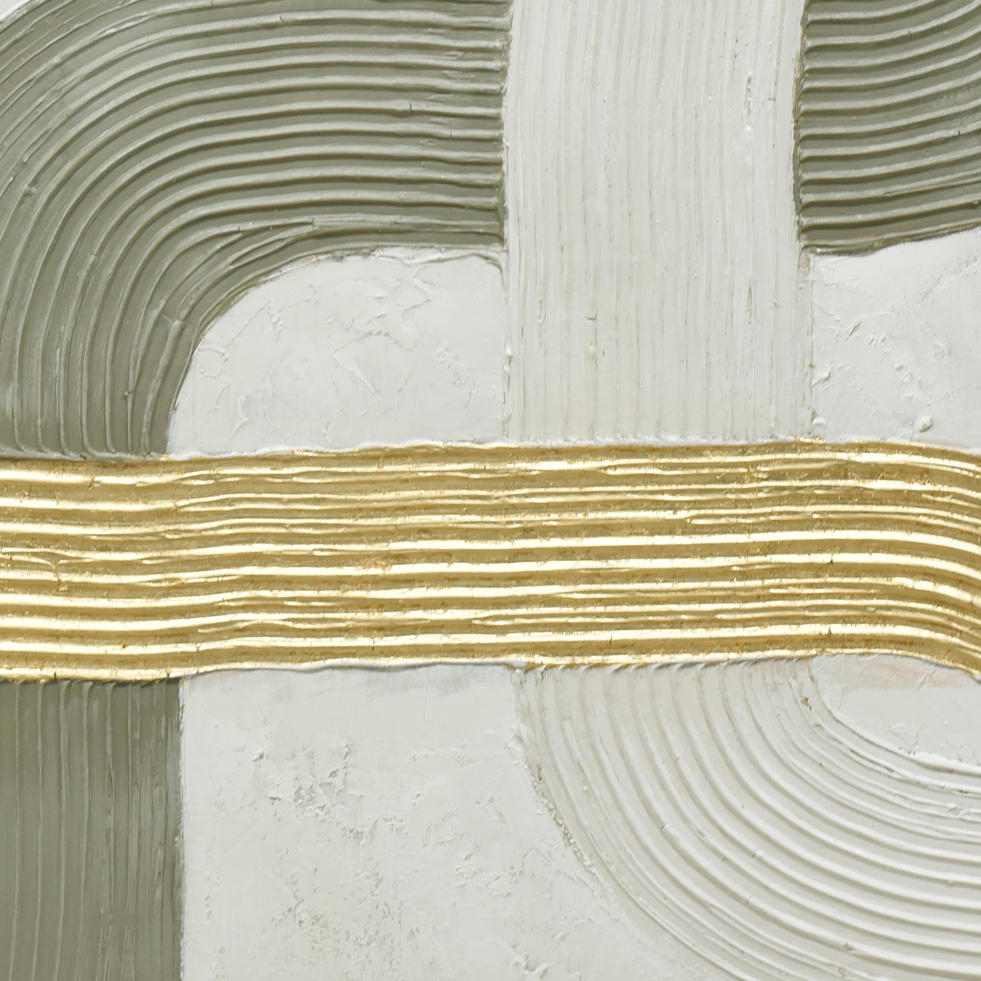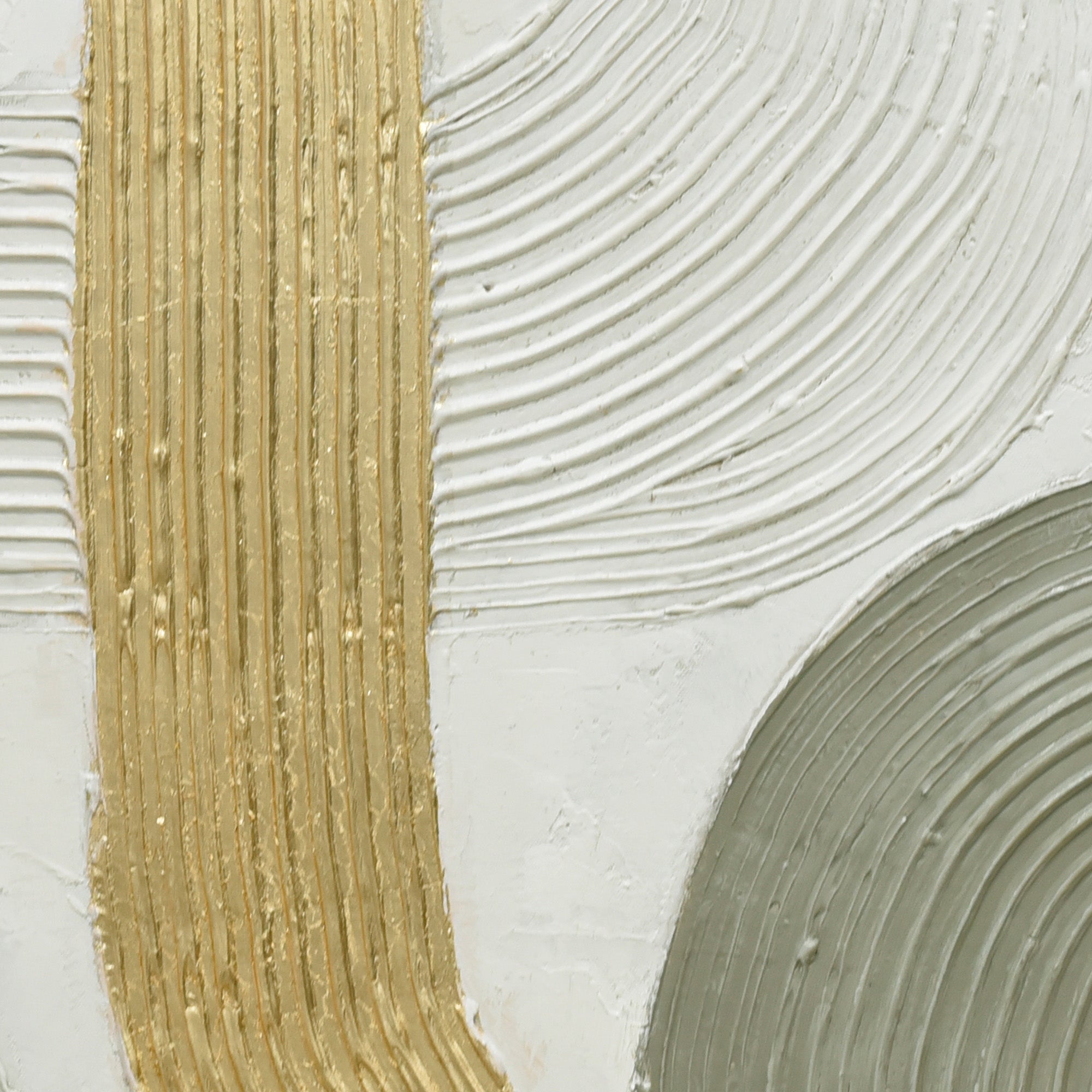The canvas tells a tale of five unique journeys, represented by intertwining grooved roads. Each road, with its bold thick texture, is an entity in itself — two roads in pristine white, one in the enigmatic shades of sage and jungle green, another in the luxurious hue of gold, and the final one in a soft, dreamy baby pastel blue. These paths meander, intersect, and intertwine, symbolizing the myriad connections and serendipities of life against the vast expanse of a white backdrop. This masterpiece serves as a poignant reminder of the beautiful unpredictability of life and the paths that intersect, diverge, and converge again.
