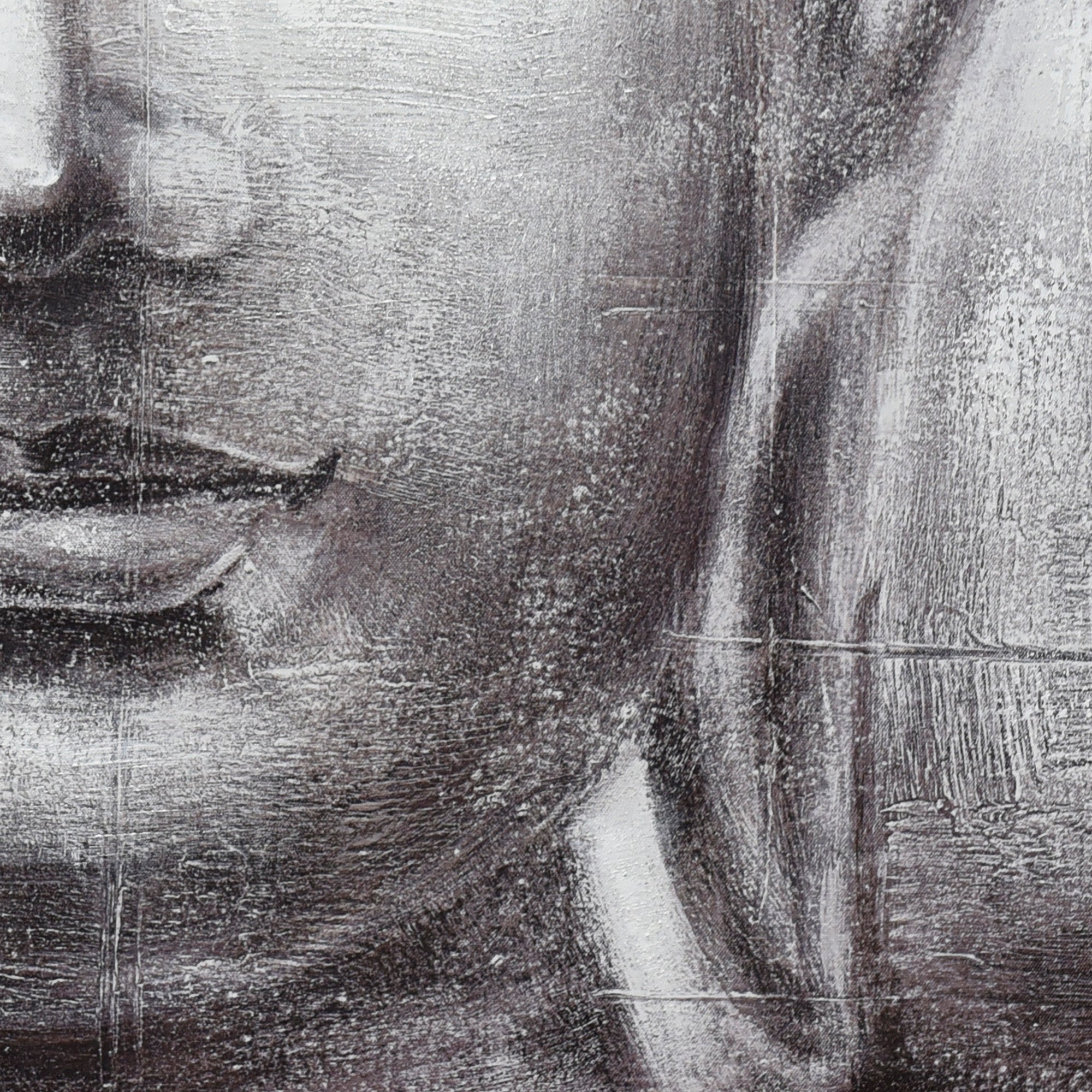 "Ethereal Enlightenment" is a captivating exploration of spiritual depth and tranquility. Dominating the canvas is the visage of Buddha, rendered in mesmerizing shades of grey and charcoal. The closed eyes evoke a sense of profound introspection and serenity, guiding viewers into a state of meditative reflection. What adds an ethereal touch to this otherwise muted palette are the delicate gold highlights, gracing the head and the bindhi (urna), symbolizing the third eye's awakened state. Every brushstroke, every gradient, is meticulously crafted, marrying hand-painted artistry with printed precision. Encased in a champagne-hued frame, the artwork exudes a sense of opulence and reverence. "Ethereal Enlightenment" stands not merely as a visual treat but as a gateway to inner peace and spiritual contemplation.