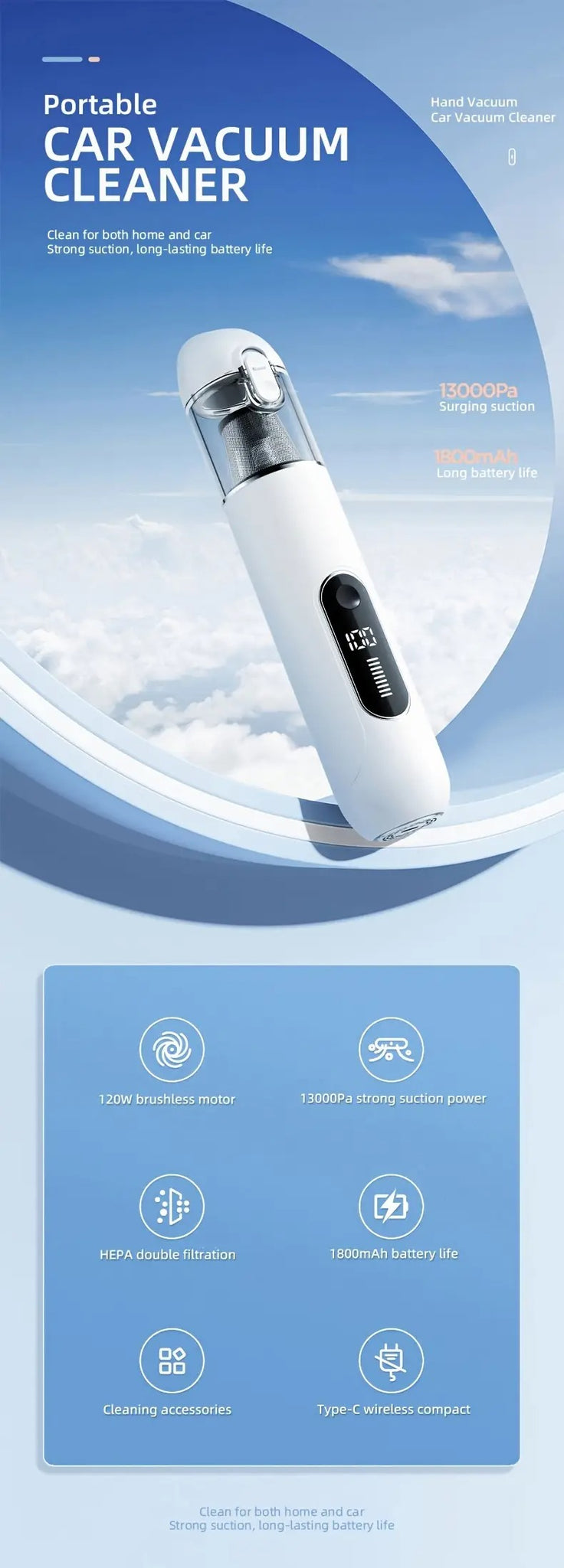 The NNETM Cordless Vacuum Cleaner delivers powerful 13000Pa suction for deep and efficient cleaning in both home and car environments. Its 120W brushless motor ensures consistent performance while the 1800mAh lithium battery offers up to one hour of uninterrupted use. Designed with a one-touch emptying system and integrated blow-suction function, this compact vacuum provides a smooth cleaning experience with minimal effort.