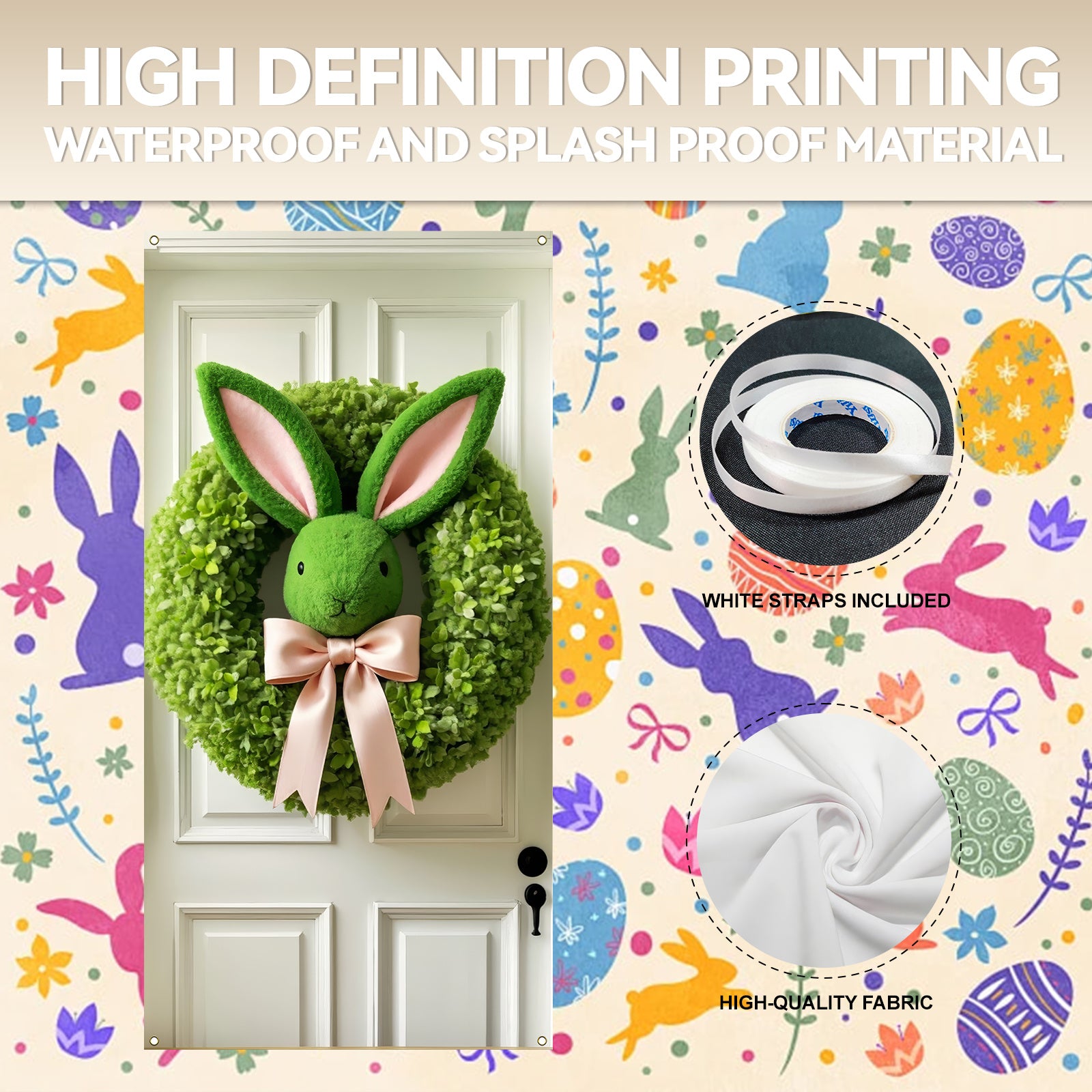 Product Description: The NNETM Easter Bunny Wreath with Greenery and Linen Bow is the perfect addition to your festive decor. This 90x180 cm (35.4x70.9 inches) polyester blend banner is designed for easy hanging in entryways, rooms, or any farmhouse setting. With its multifunctional use, it requires no power, making it an ideal decoration for any celebration. Refer to the image for dimensions and design details.