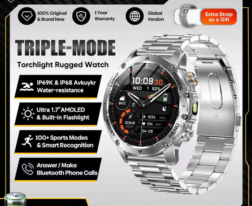 With IP69K & 5ATM waterproof protection, a massive 1000mAh battery, and 100+ sports modes, it’s built to perform under pressure — from workouts to outdoor adventures. Stay connected with Bluetooth calling, monitor your health in real time, and navigate the day confidently with its built-in flashlight and intelligent features. Power, precision, and performance — all on your wrist.