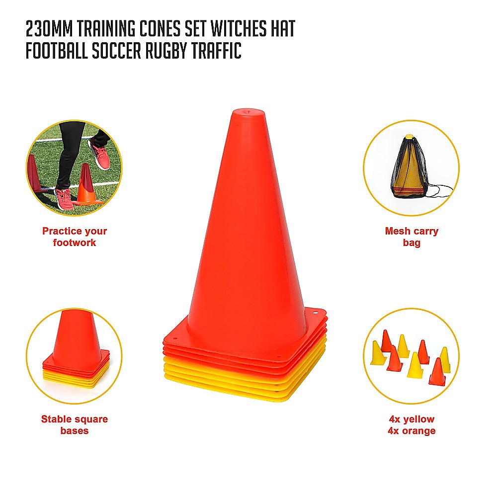 Training for rugby or football is a breeze with these 230-millimetre training cones from Randy & Travis Machinery. This eight-cone set allows you to run patterns, practice footwork, or weave in and out of the cones to hone your agility.