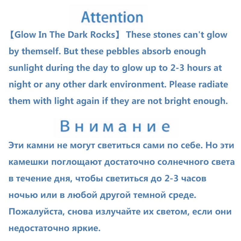 A: The luminous stone is a light-storing product. The principle is that it can emit light by absorbing the light source. Each time the light is emitted is 8-12 hours, during which the first 1-2 hours is the high light period and continues to glow. The received product did not emit light because there was no absorption light source during the logistics. As long as you get sunlight or light for a while, you can shine again.