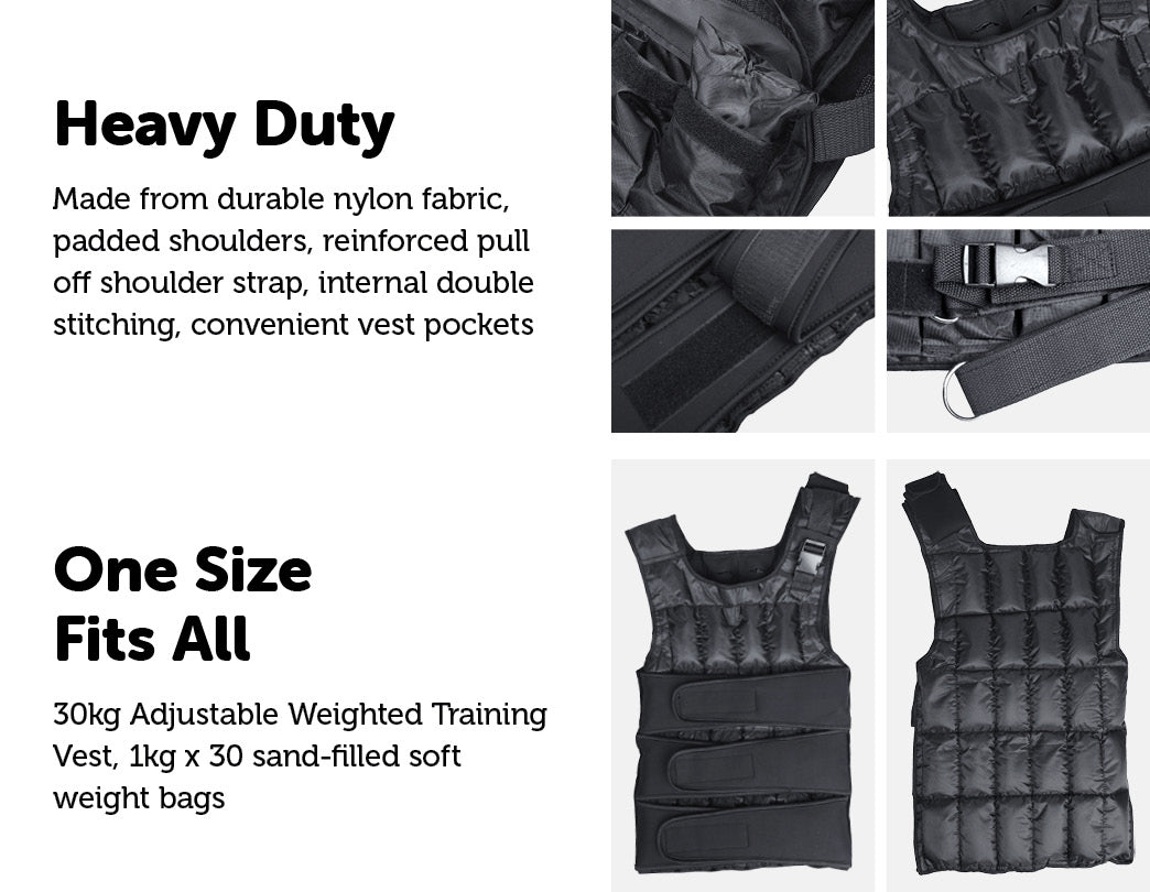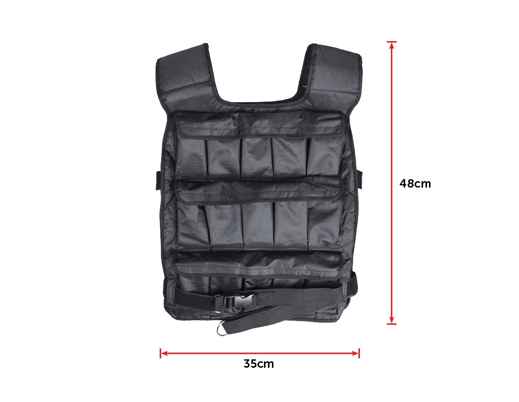 Our 30kg adjusted weighted vest is the ultimate in design. The vest pocket accommodates the temporary storage of your phone, multi-media device or Gym Boss during your workout. The nylon vest features extra padding and includes sand-filled bags for individual weight requirements. These weight bags can be added or removed for customization of individual fitness routines.