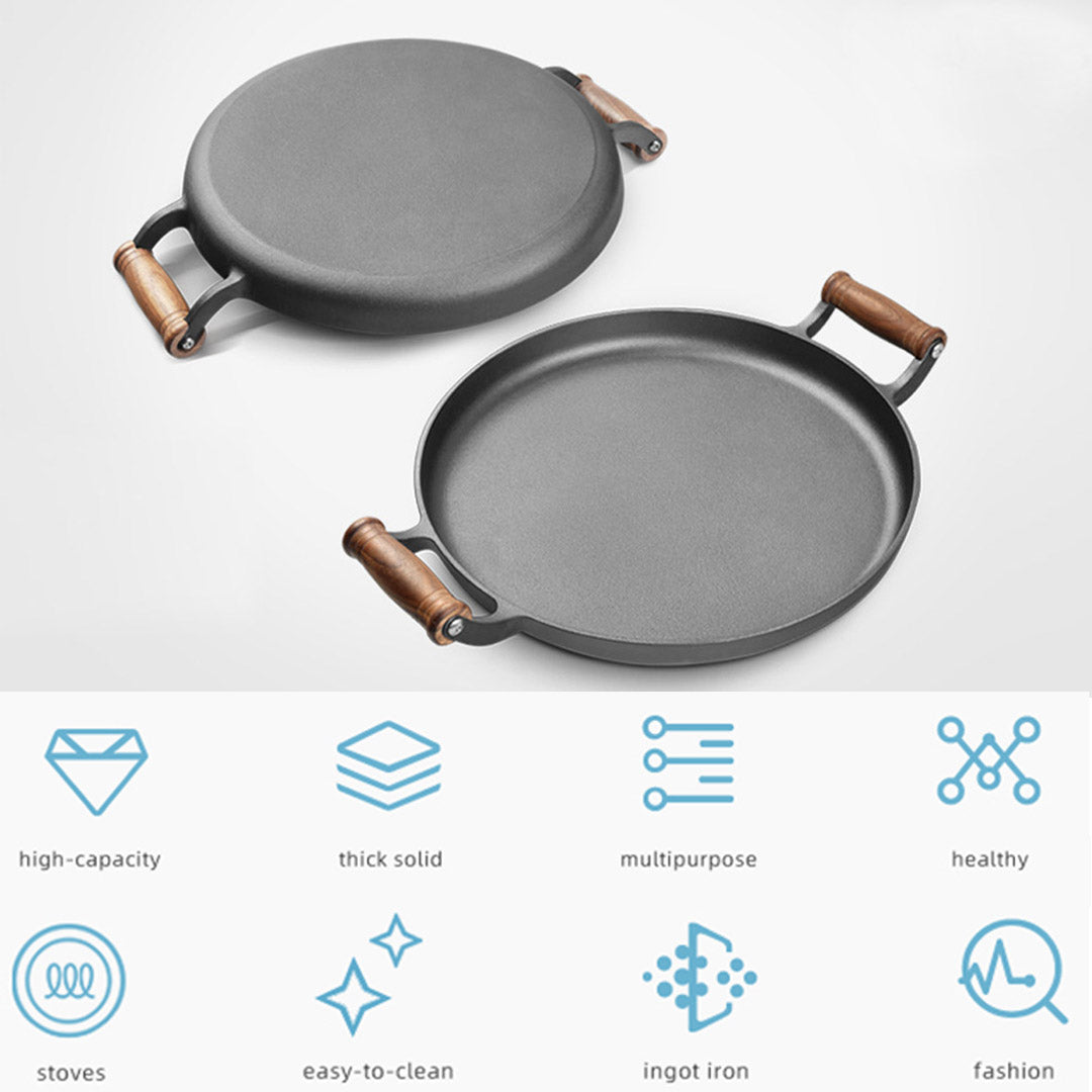 NNEAGS 35cm Cast Iron Frying Pan Skillet Steak Sizzle Fry Platter With Wooden Handle No Lid