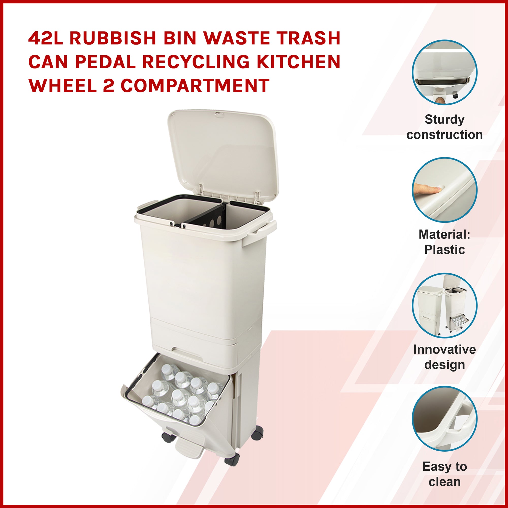 NNEDSZ 42L Rubbish Bin Waste Trash Can Pedal Recycling Kitchen Wheel 2 Compartment