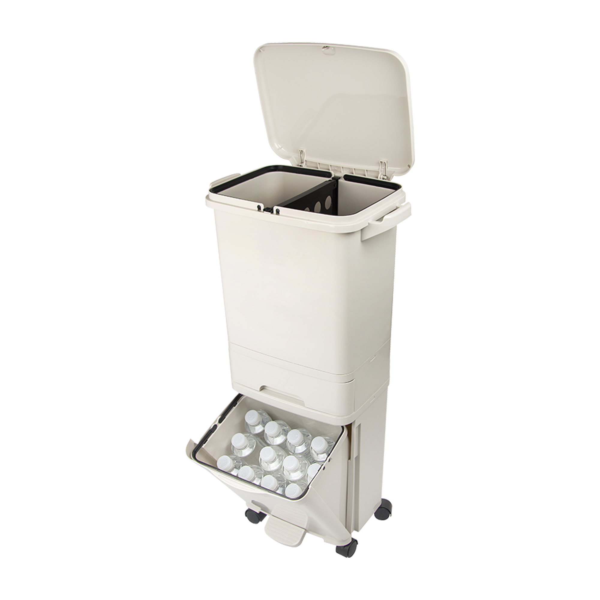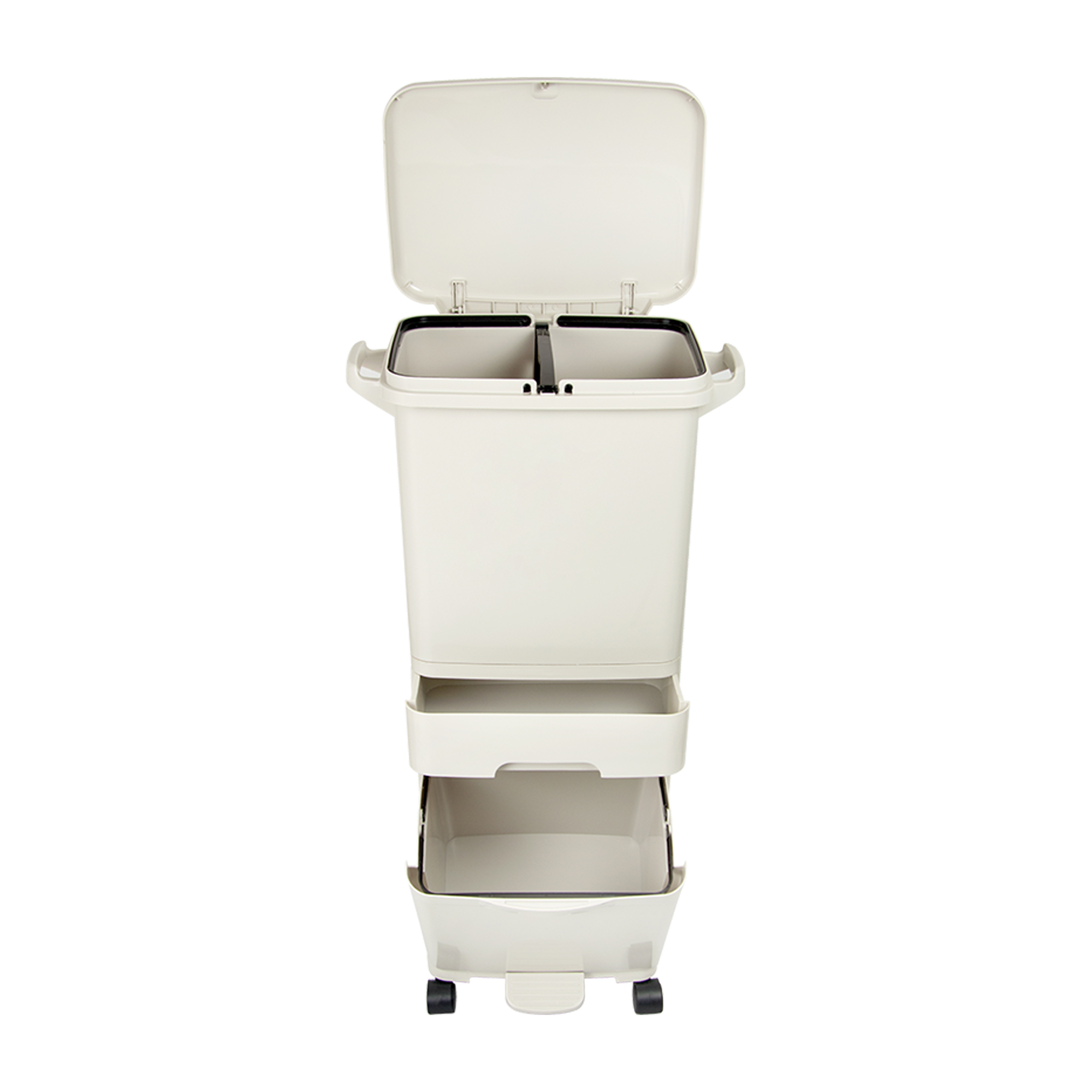 More than just a rubbish bin — or even a recycling bin— this 42-litre combination waste disposal system from Randy & Travis Machinery features two main compartments and a bonus drawer in the middle. That's not all. The top compartment has two sections, allowing you to divide compostable rubbish from paper waste. Side hooks allow you to easily hang bags for filling. Use the middle storage drawer to stash liners, ties, or other supplies, while the bottom compartment opens up at a 45-degree angle to store recyclables. When you're ready to take it out for recycling, simply lift it out and carry it by its handle. With wheels that turn a full 360 degrees in all directions, it's easy to move.