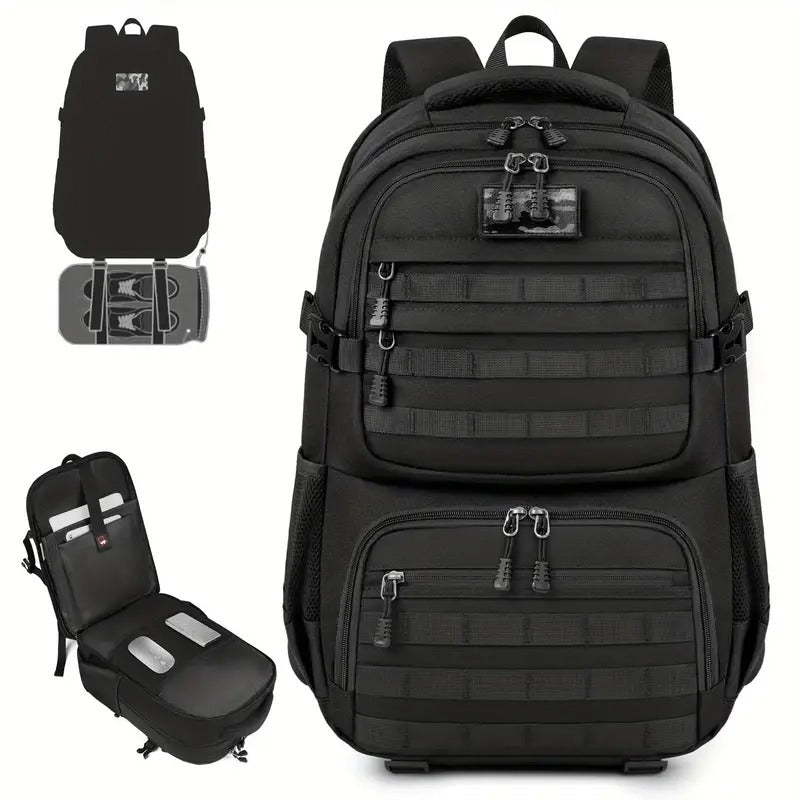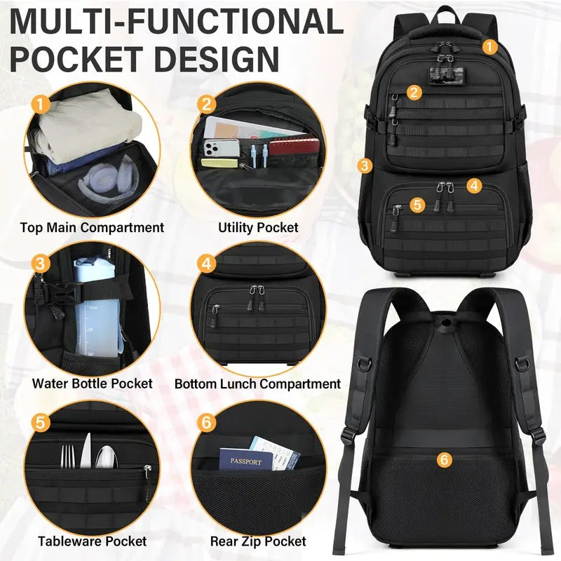 The NNETM 50L Travel Backpack for Men combines functionality and modern design for daily use and long trips. It features a roomy main compartment with a secure padded section that fits up to a 17.3-inch laptop, making it ideal for work, study, or travel. With a TSA-compliant structure and soft shell design, it ensures comfort and hassle-free packing. The durable polyester exterior keeps your belongings protected while maintaining a sleek profile.