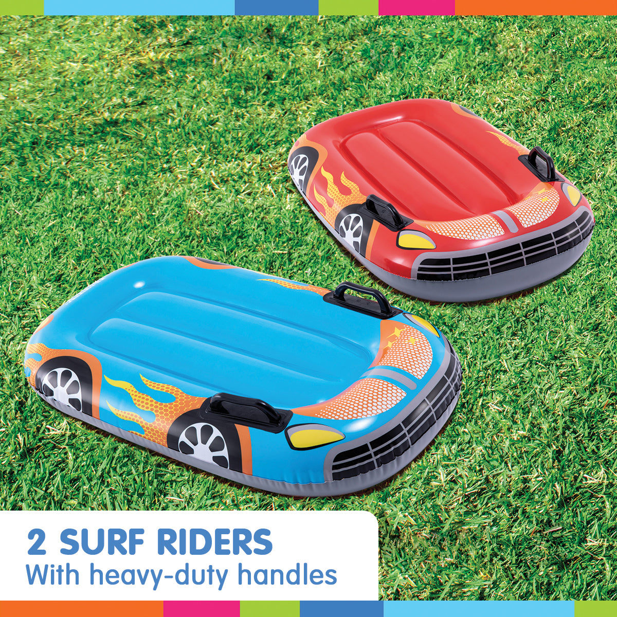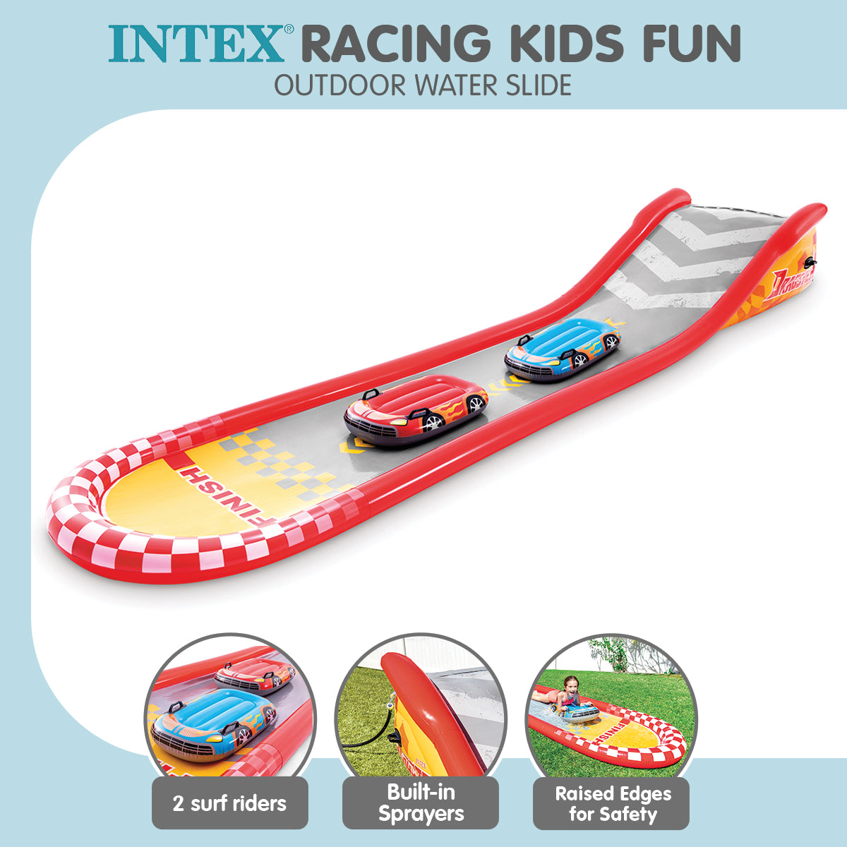 Get the kids active and splashing with the Intex Racing Fun Slide. At 5.6m long, it provides plenty of space for racing and sliding. Kids will love launching from the ramp on the race car bodyboards, all the while speeding towards the finish line! The built-in sprayers easily attach to a standard garden hose, perfect for keeping cool under the summer sun. Ready, set, splash!