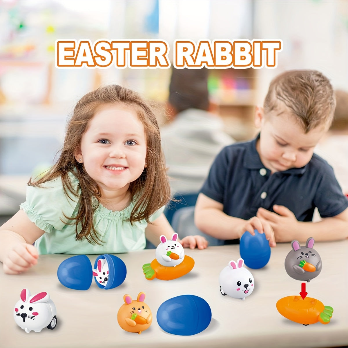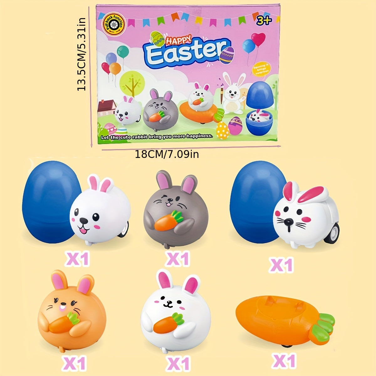 Fun Easter-themed surprise egg toys with pull-back rabbits and carrot cars, perfect for party favors and gifts!