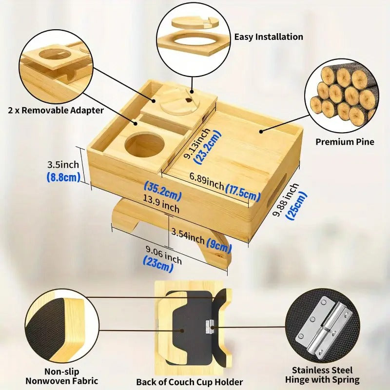 The NNETM 7-in-1 Sofa Cup Holder combines convenience and functionality in a compact, modern design. This all-in-one unit includes a cup holder, side table, phone mount, and a storage drawer — ideal for keeping your essentials close. Whether you're watching, lounging, or working, the rotating phone holder and clip-on table adapt to your needs.