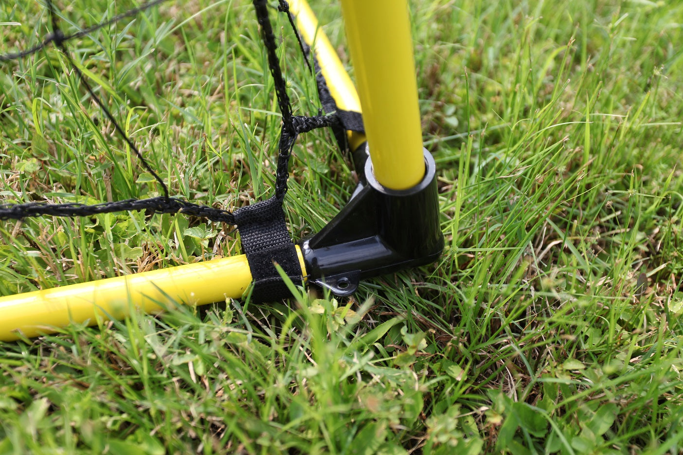 The Randy & Travis goal features a number of unique features that ensure safe and easy assembly. It comes equipped with Tension-Tie poles that snap together to create a strong frame that won't pull apart. The two-ply netting is kept in place with steel ground stakes and Velcro net attachments. Disassembling the goal after use is just as easy as setting it up. The goal is fortified with a heavy-gauge tarpaulin facing and comes with a carrying case for easy transportation and storage.