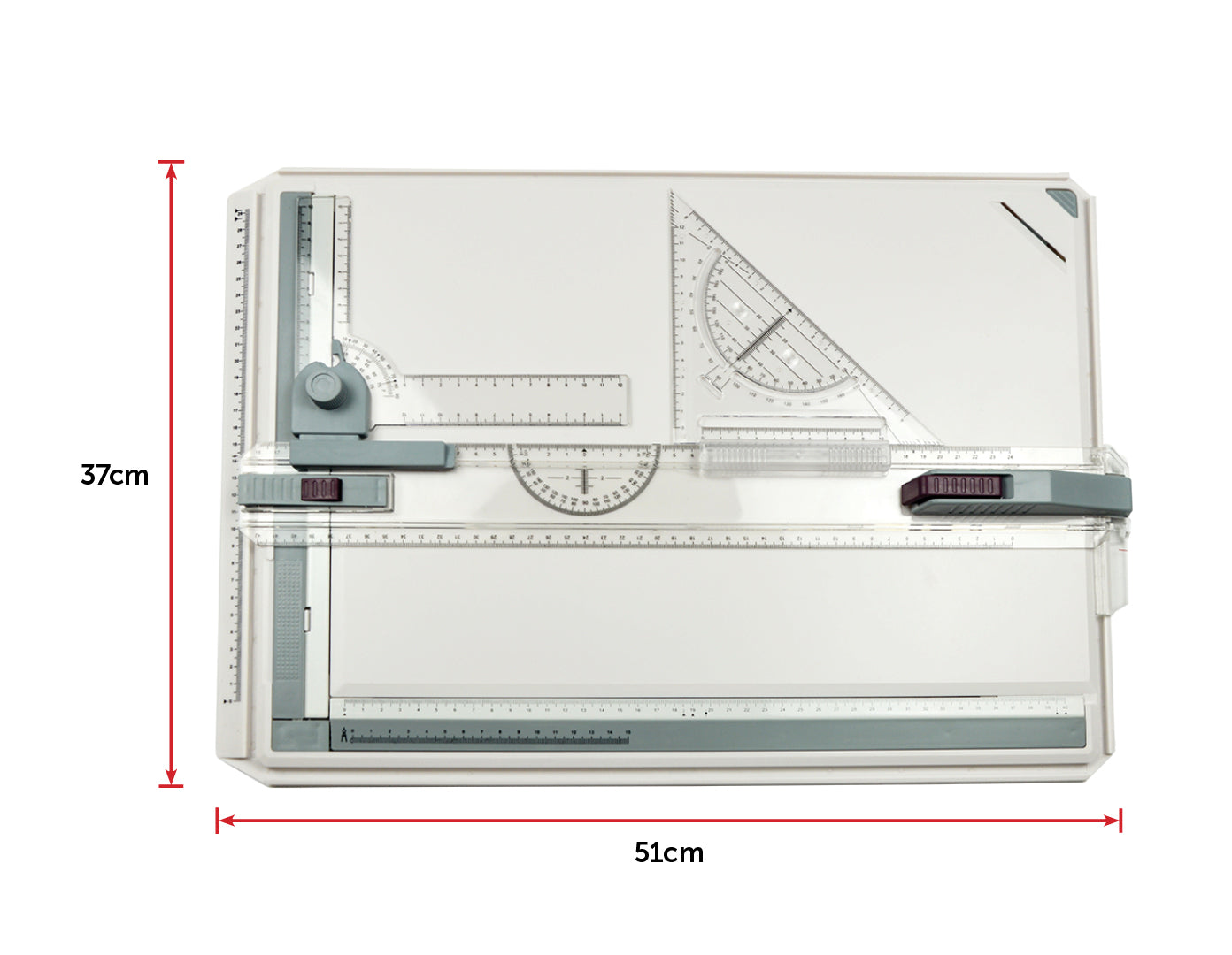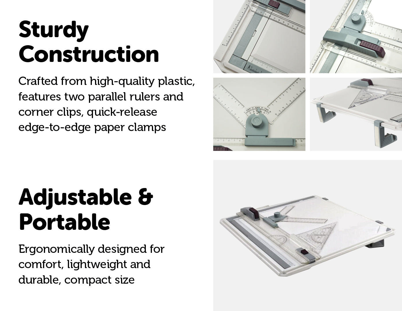 Crafted from high-quality plastic, this drawing board table set is as durable as it is light in weight. Two parallel rulers and corner clips ensure stability, making your drawings more accurate. Quick-release paper clamps on both sides secure your drawing paper.