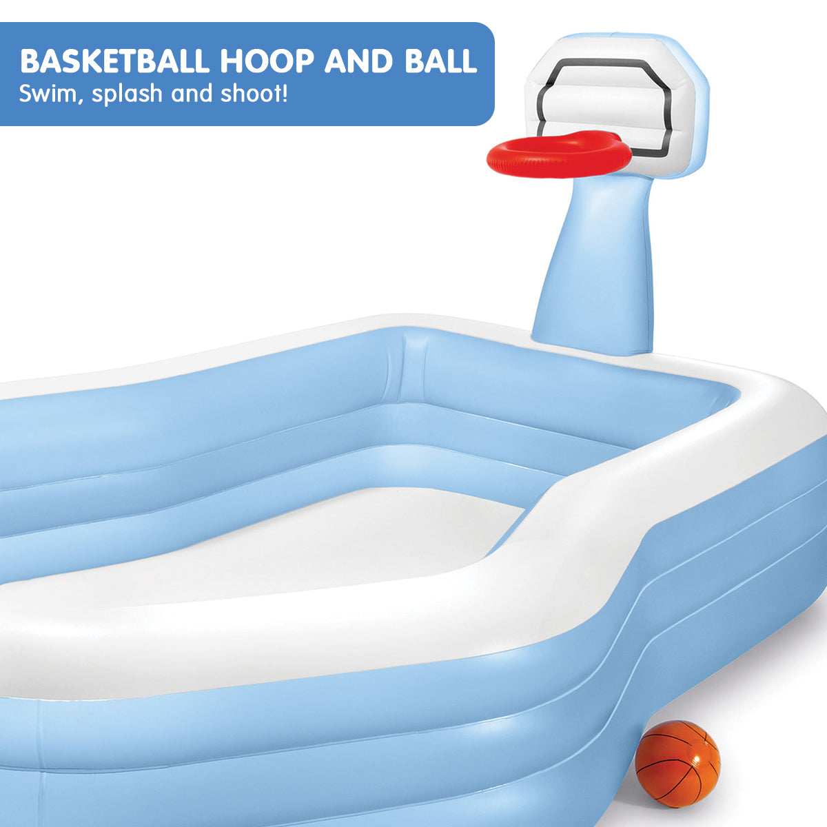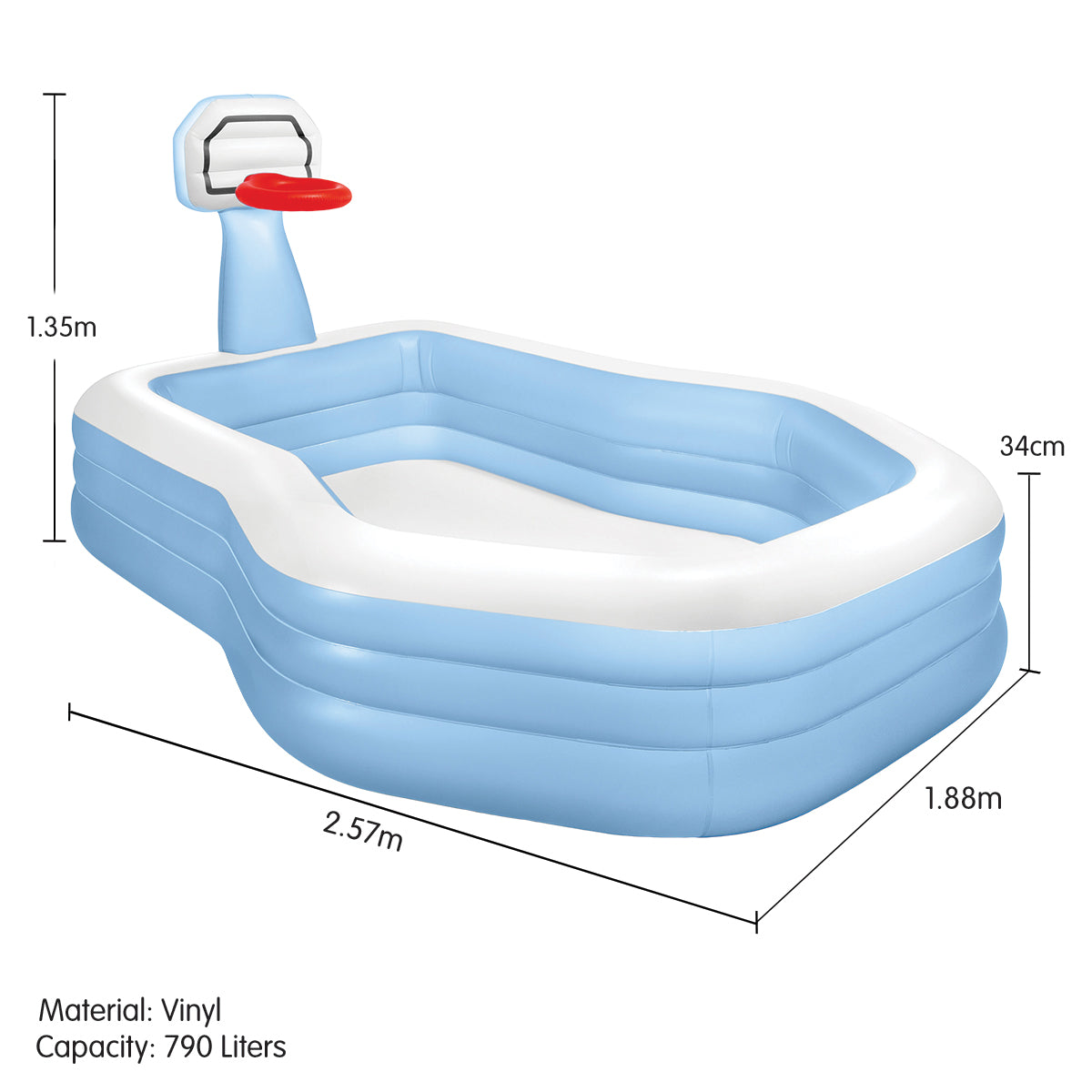The Intex Shootin Hoops Family Pool is the perfect way to chill and relax this summer. It comes with an inflatable hoop and a mini ball for the coolest basketball matches! At 34cm deep, this pool is designed for the whole family to enjoy. Let your little MVPs practice their dunks while you sink a three-pointer from across the yard! When the day ends, simply pull on the drain plug for convenient cleanup!