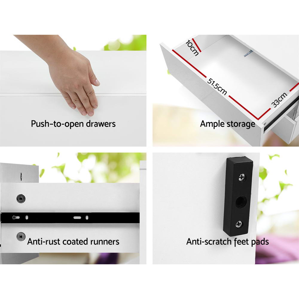 Tired of fumbling in the dark for a light switch in the middle of the night? With our Artiss Lume LED Bedside Table, your problems are solved. The bedside table comes with built-in RGB LED lighting that can be customised into 16 different colours to suit your preference. Not only will the table create a beautiful ambience, it will also save you from buying extra bedside lamps or nightlights. Available in black and white, the bedside table will be the perfect addition for your modern bedroom with its contemporary and linear design. Or you can keep one in the living room to wow all your houseguests. The two drawers have push-to-open mechanisms to maintain the sleek appearance and they provide ample storage for all your bedside, or living room, essentials.