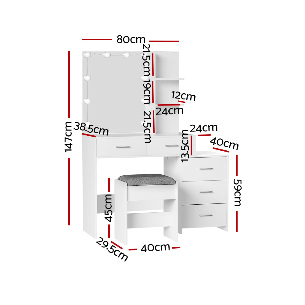 Feel like a star straight out of Hollywood with the Artiss Dale Dressing Table. Packed with generous storage and other convenient features, your new beauty routine will be a breeze. Made from quality particleboard with a white melamine finish, the table is built to last. The Hollywood-style makeup mirror is surrounded by bright LEDs for the perfect illumination. Choose from warm, neutral and daylight white light so you can always look stage-ready. The adjustable side chest features open shelves that you can use to display trinkets or beauty products. Five generous storage drawers open smoothly on anti-rust runners, giving you instant access to your beauty essentials. A foam-padded PU leather stool allows you to sit in comfort while applying make-up or skincare and can be neatly tucked away when not in use. Easy to install and even easier to maintain, you'll love getting ready for the day in front of your new Artiss Dale Dressing Table.