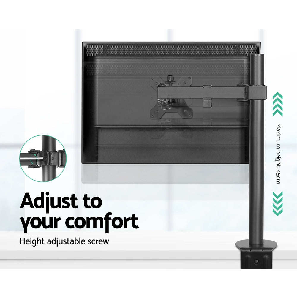 Add some extended mobility to your monitor with our Artiss Fully Adjustable Single Monitor Arm. With it, you can extend it up to 43cm to set your preferred viewing position and retract it with ease. Height adjustments can be easily done by twisting the height adjustment screw. It also allows you to swivel your monitor 180, rotate it 360 or tilt it up to 45 and set in either landscape or portrait format. Using the detachable VESA mount, you can mount any monitor size of up to 32with a maximum weight capacity of 8kg. Other great features include alternative setups, cable loops for neat and tidy cabling and a tools holder for allen keys. Not least, made from heavy-duty steel, the monitor arm is designed to stand up to longlasting use without missing a beat. All the necessary mounting hardware and an assembly manual are included in the package for a hassle-free set up.