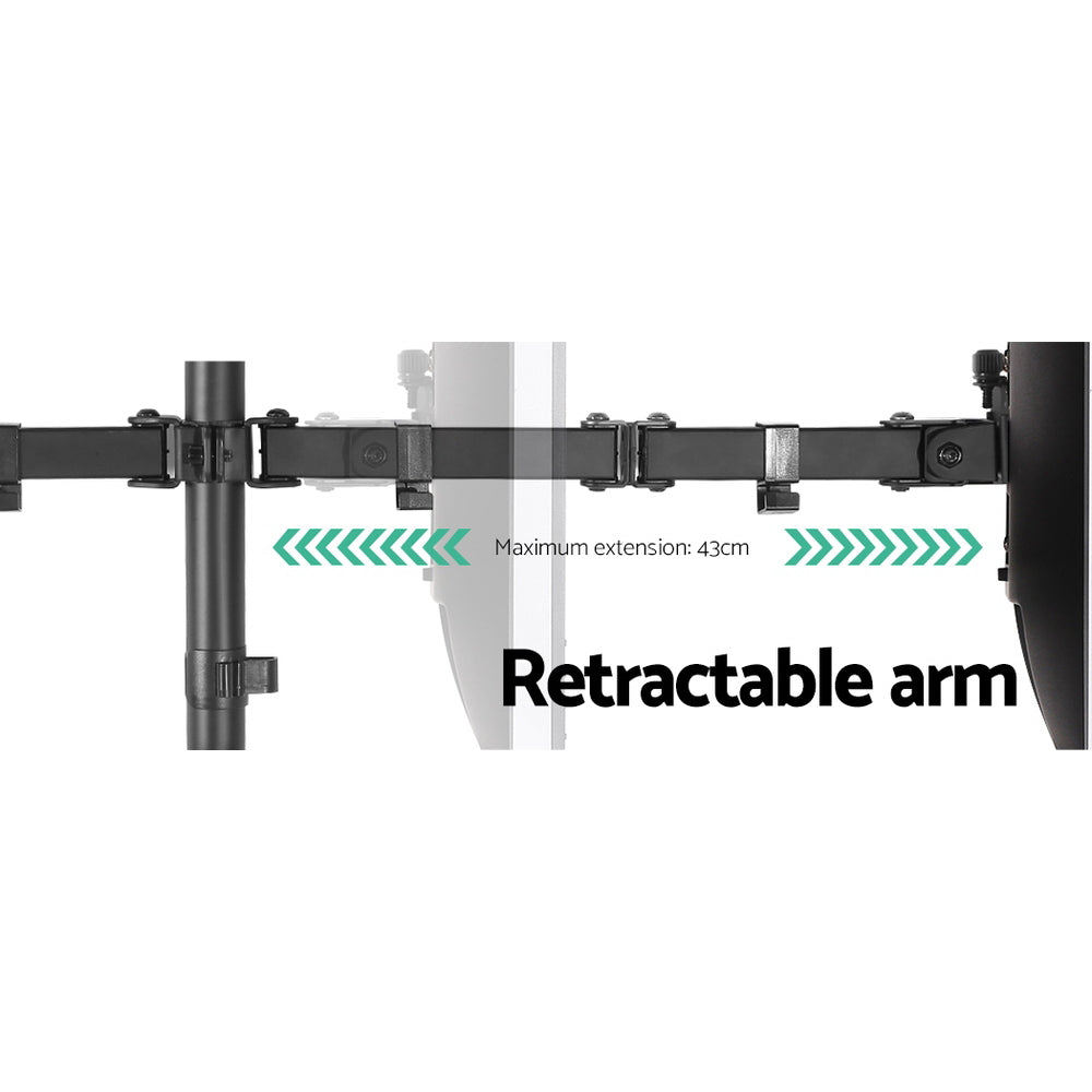 Add some extended mobility to your monitor with our Artiss Fully Adjustable Dual Monitor Arm. With it, you can extend both arms up to 43cm to set your preferred viewing position and retract it with ease. Height adjustments can be easily done by twisting the height adjustment screw. It also allows you to swivel your monitor 180°, rotate it 360° or tilt it up to 45° and set in either landscape or portrait format. Using the detachable VESA mount, you can mount any monitor size of up to 32* with a maximum weight capacity of 8kg on each arm. Plus, you can also fine tune the monitors? alignment with the VESA plate height adjustment. Other great features include alternative set ups, cable loops for neat and tidy cabling and a tools holder for allen keys. Not least, made from heavy-duty steel, the monitor arms are designed to stand up to longlasting use without missing a beat. All the necessary mounting hardware and an assembly manual are included in the package for a hassle-free set up.