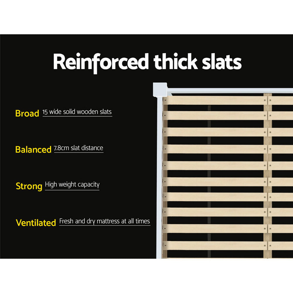Made of solid pine wood, the Rio Bed Frame is compatible with most Australian sized mattresses and ideal for use by both young and old alike. Strong and sturdy, the bed frame comes with a durable plywood slated base, reinforced angled brackets for long term support, stylish headboard, heavy-duty steel fixings and smooth edges all round. Finished in a non-toxic, eco-friendly white paint, the neutral-coloured bed frame makes for easy décor coordination. Better still, the bed frame also has ample room below it to fit in a pair of optional trundle drawers or any other storage boxes.