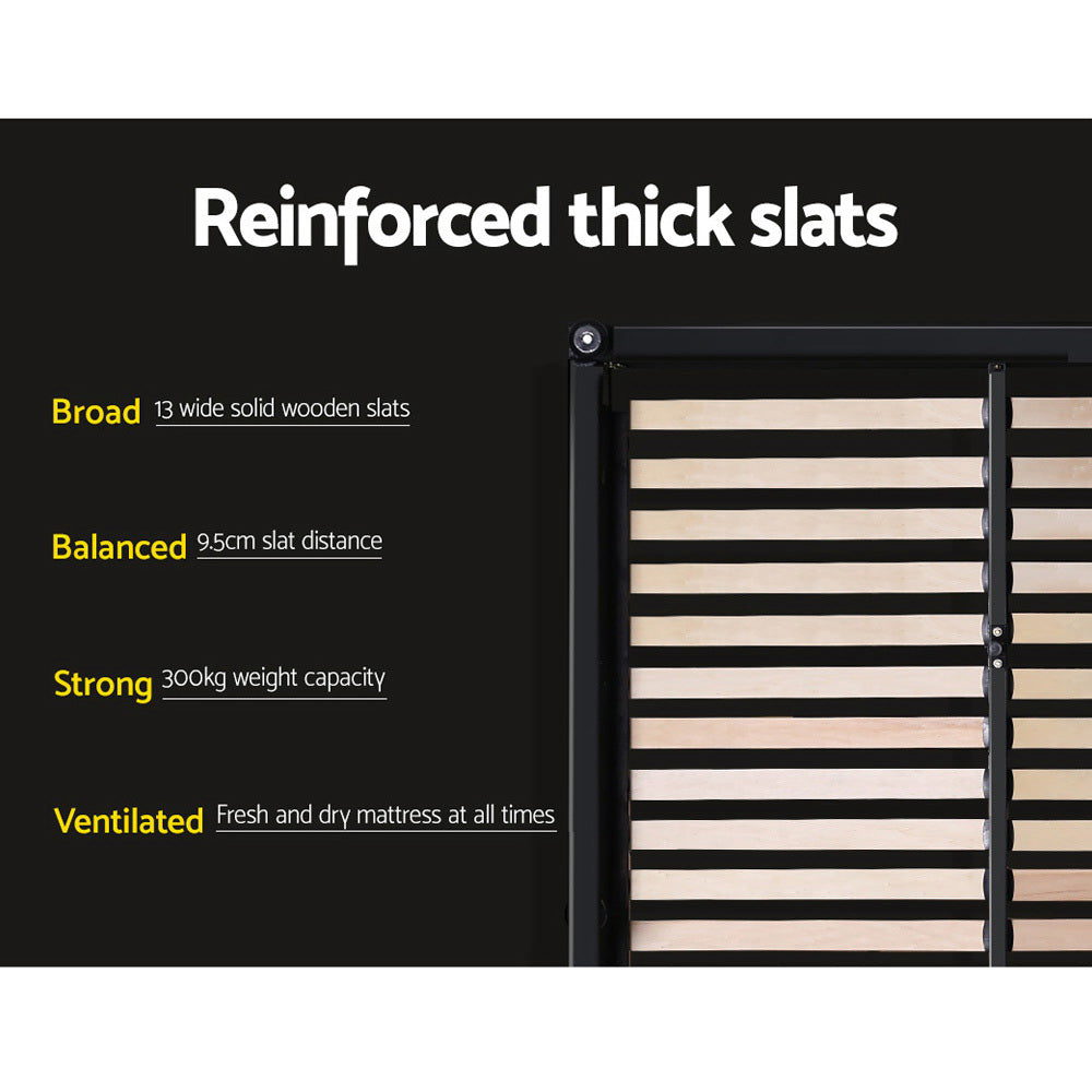 The bed frame is well-built with reinforced steel bars within its sturdy steel frame. Heavy-duty metal connectors keep the frame sturdy with additional central support from an adjustable centre support beam, so you can rest easy at night knowing you have great support.