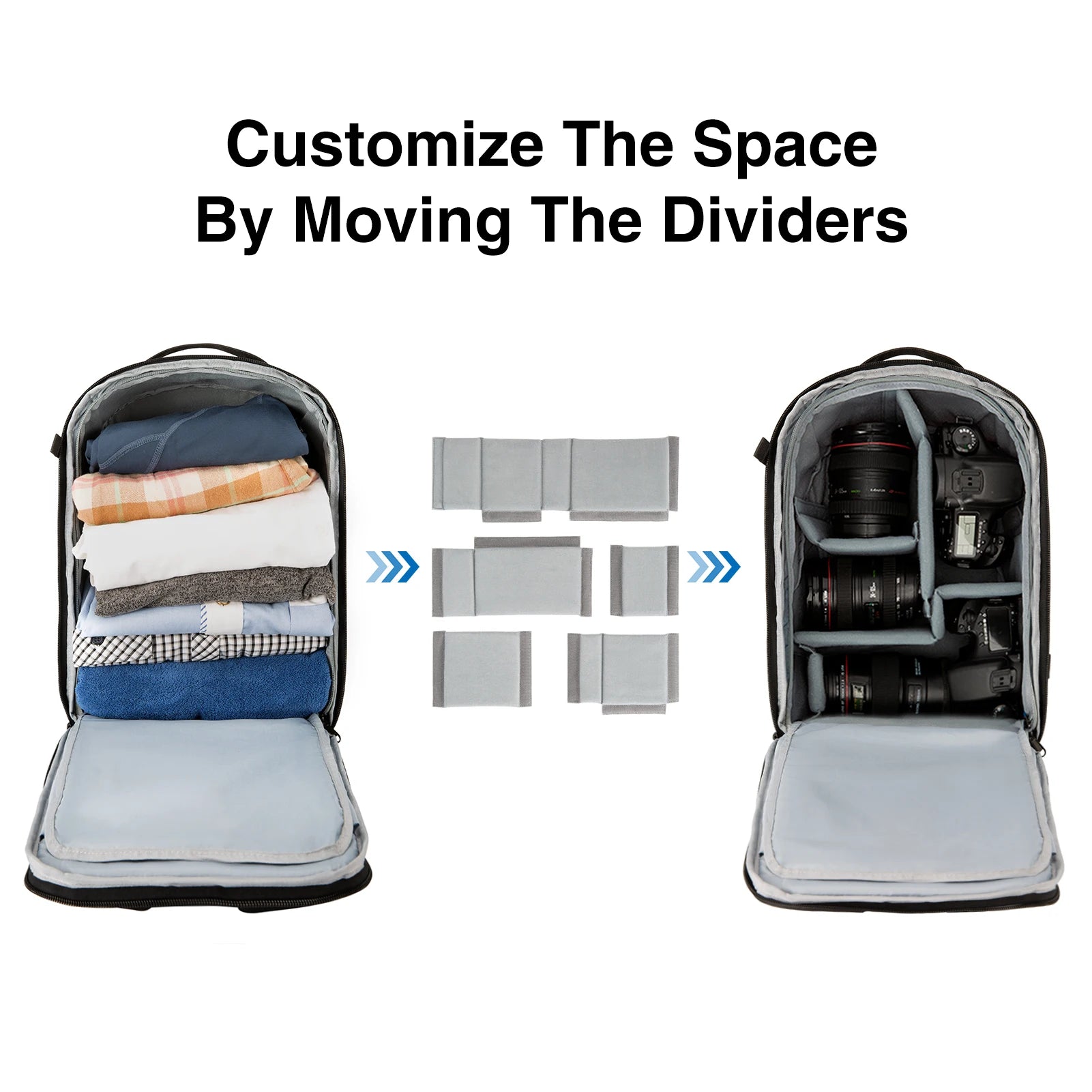 Customizable Interior: Five removable padded dividers with full-opening design for flexible organization and quick access.