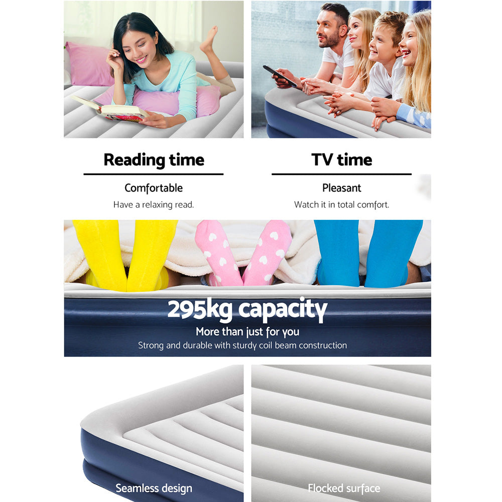 Featuring a comfortable flocked sleeping surface, the queen size air bed provides a smooth and comfy sleep each and every night. Designed with a sturdy I-beam construction, this quality air bed is suitable for both indoor and outdoor use. Inflates in just 300 seconds, You will have an instant bed ready to go whenever the situation calls for a spare mattress. Portable, easy to store and effortless to set up, this convenient air mattress provides the perfect balance of comfort, practicality and affordability.