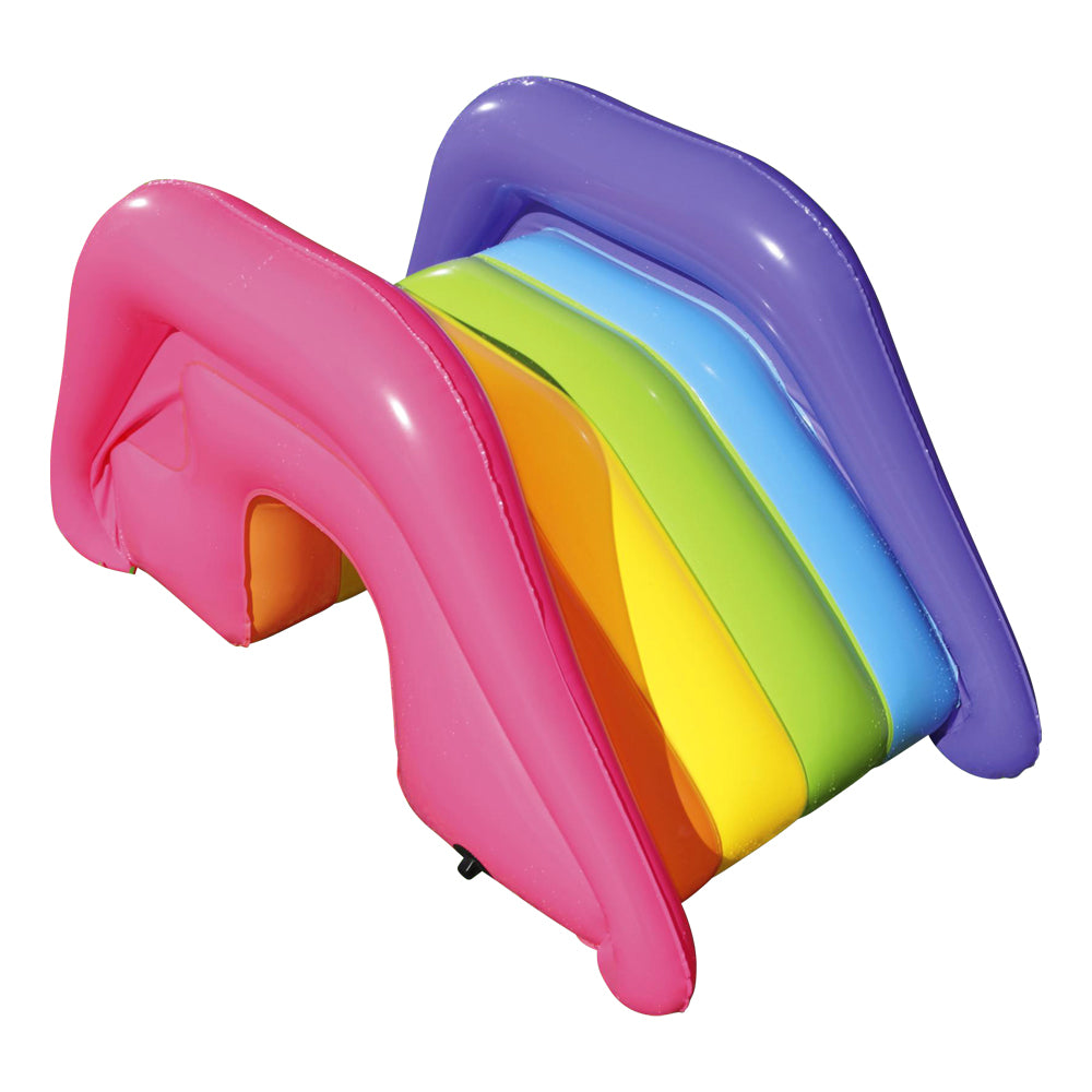 The Sunnyland Splash Play Pool is an absolute fun for every kid who loves splashing around on hot summer days. With a smiley sun icon in the middle of the pool, the play pool is most welcoming in every way. And the smiley sun also has a built-in nozzle that shoots water up to keep kids cool and let them enjoy even more thrilling antics. Set-up is as easy as filling up the pool with water and then connecting it to garden hose for the fountain to get going. Better still, the rainbow slide is fully adjustable with built-in grommets to keep it steady for hours of endless fun. Not least, the inflatable palm tree provides the perfect backdrop for a tropical