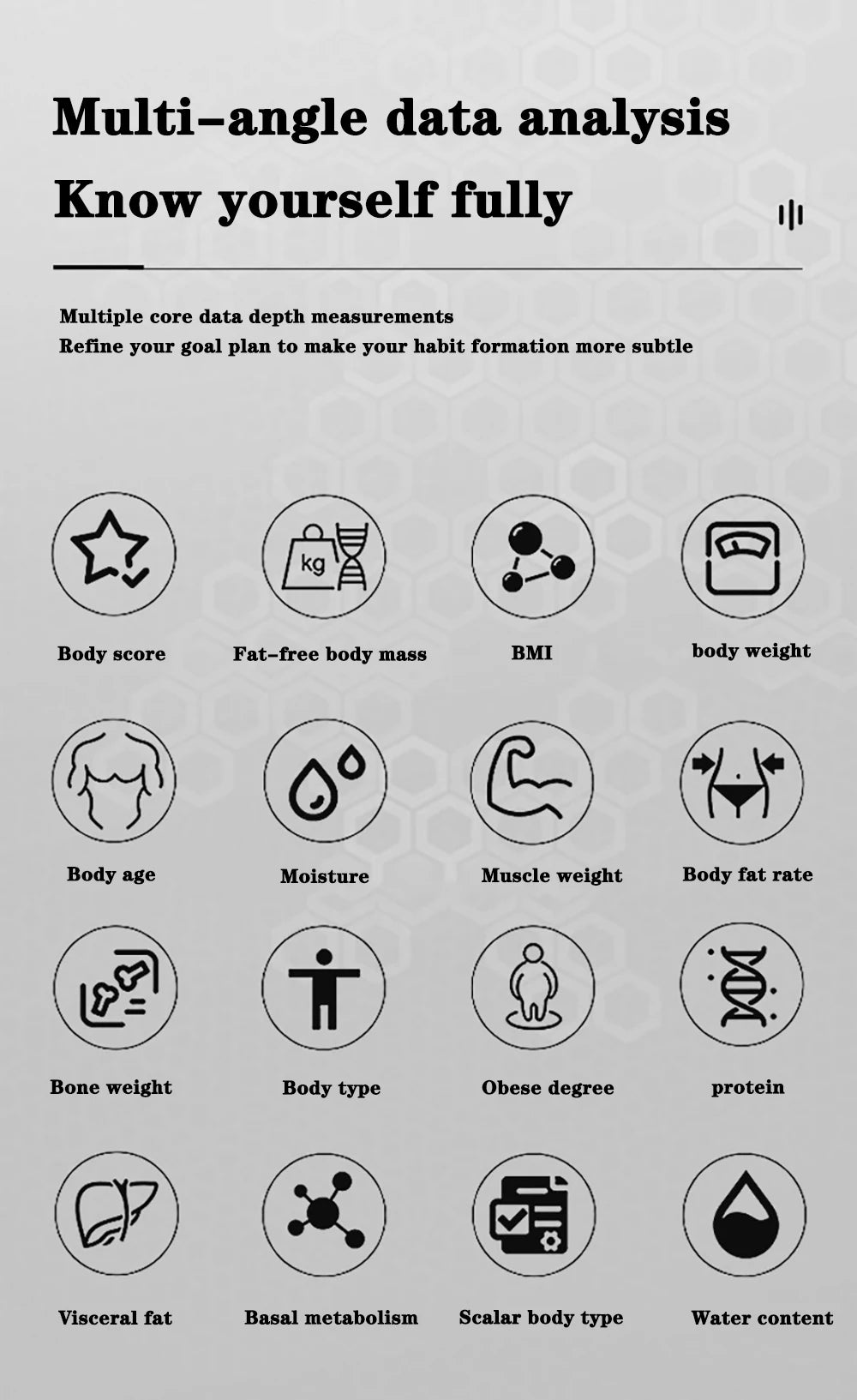 Comprehensive Body Analysis – Measures 20 body composition metrics, including body fat, muscle, BMI, water, and bone mass.