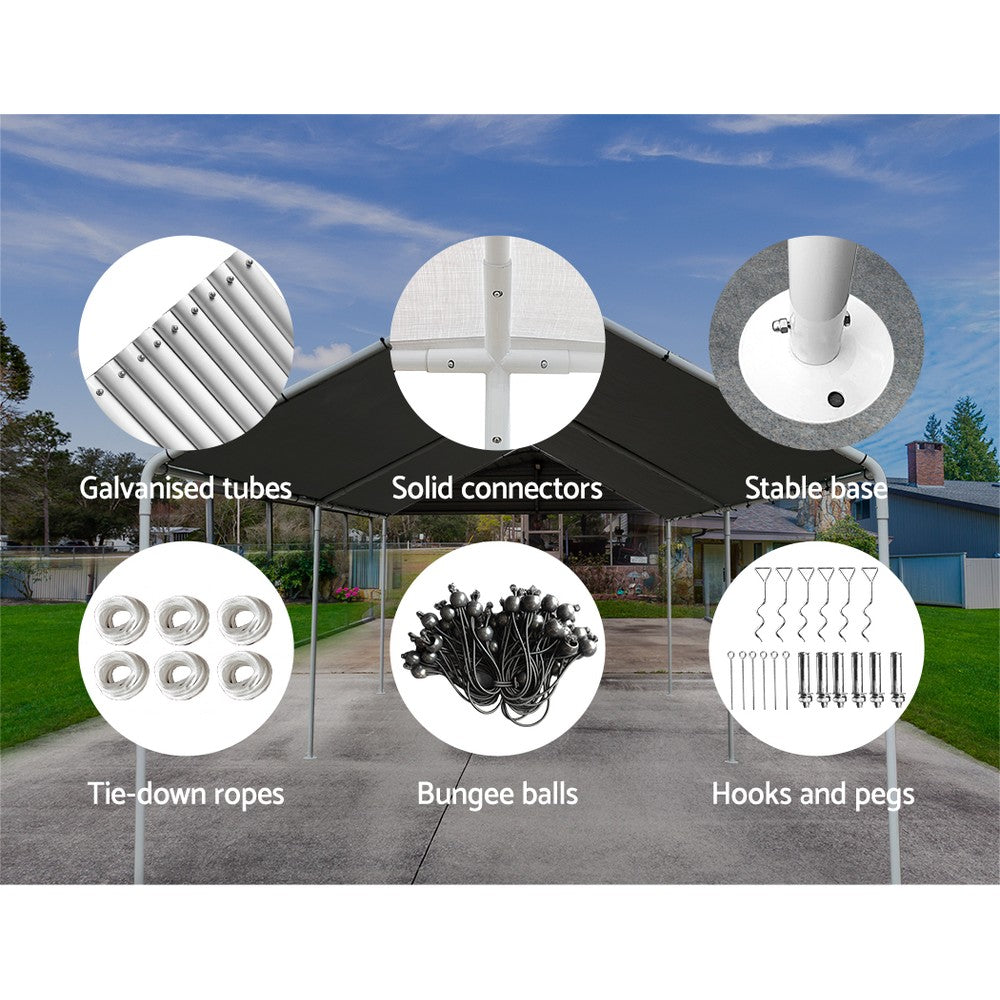 Do you lack garage space at your house? Or go camping often? With our Temporary Carport, you can keep your car covered and protected from the elements no matter where you are. The sturdy powder-coated steel poles, connectors and feet keep the entire structure steady and firm in all weather conditions, whilst the 200gsm PE canopy is both UV and water-resistant. Bungee balls, tie-down ropes, hooks and pegs are included to firmly connect all the parts and secure them to the ground. When the carport is not being used to house your car, you can use it as a standard marquee for garage sales, outdoor functions, trade shows and the like. As the structure is easy to set up then pull down and completely versatile, our carport is just perfect for all your temporary outdoor coverage needs.