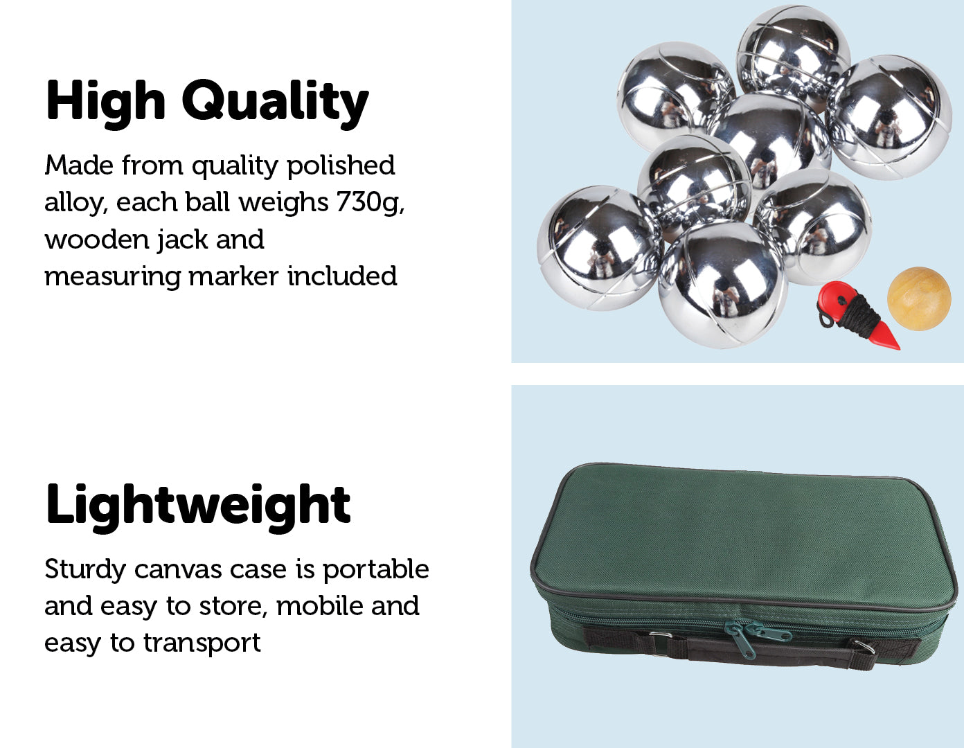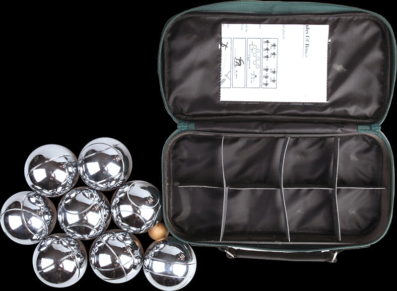 Our deluxe boule set is not only shiny and beautiful it guarantees family fun for hours on end. The set comes with eight 75mm diameter boules of polished alloy, one 35mm wooden jack, a measuring device that will settle any scoring disputes and a green canvas carrying bag that makes the game mobile and easy to transport.