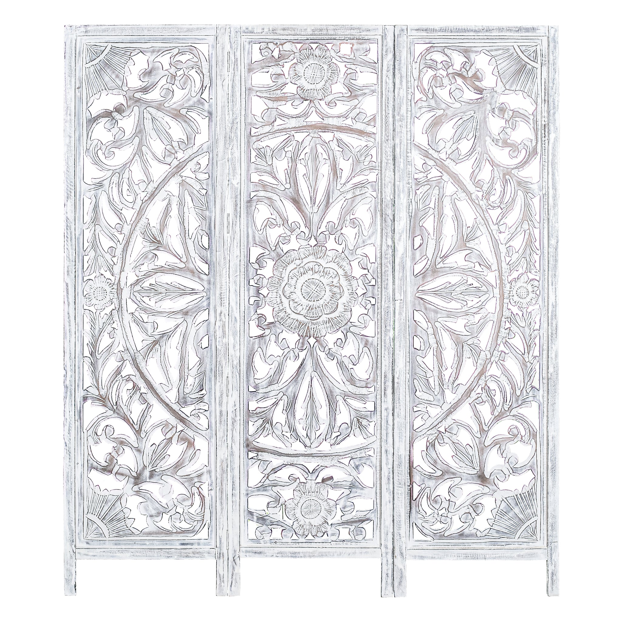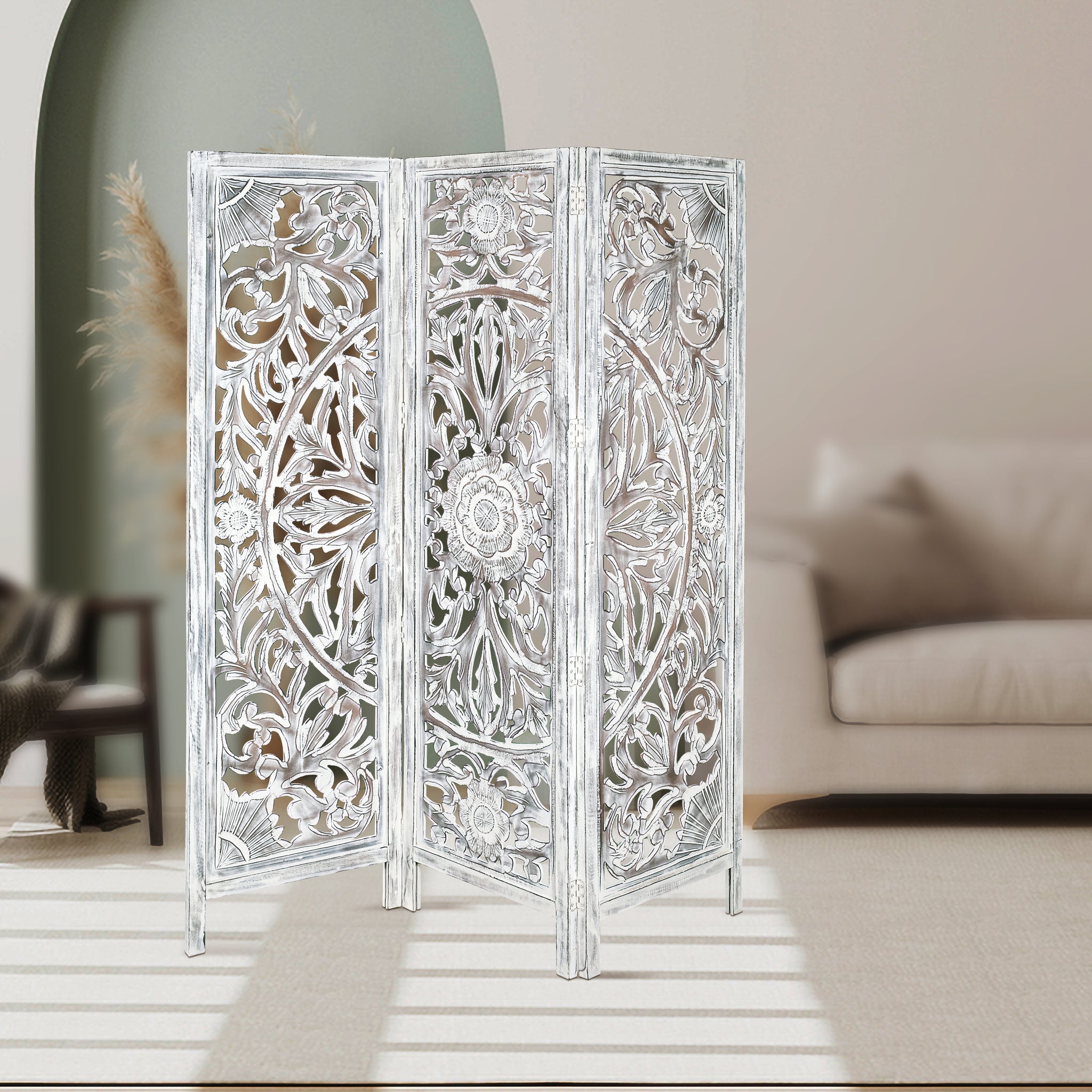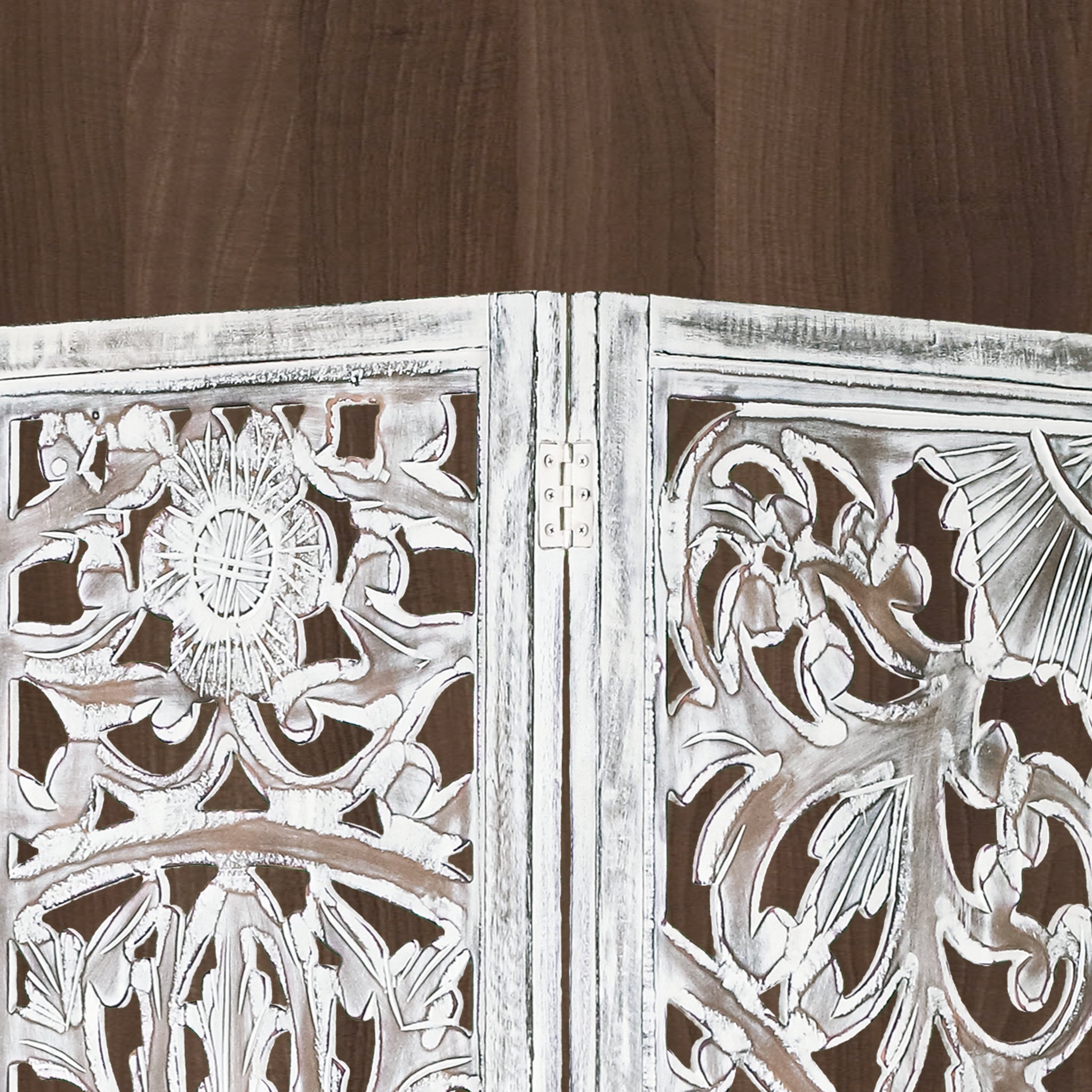 Effectively use the available space in your home with this room divider. The timber screen creates a private space in a room while also adding to its aesthetic appeal. The screen in white antique finish is designed in an exotic pattern using sustainably harvested solid mango wood. This particular wood is well-known for its high water resistance, long durability, and beautiful texture. The traditional style timber screen with strong legs can extend up to 2 metres and serves as both a space-saving and a space-dividing furniture piece. The artistic work on the screen, which includes engraved, large size flower replicas at regular intervals, gives it a stunning appearance, filling the entire area with beauty and positivity. The screen is divided into 3 panels that are easily foldable. Lightweight yet strong, the room divider uses high-performance metal hinges that can withstand daily use. This fully assembled timber screen comes with a one-year warranty.