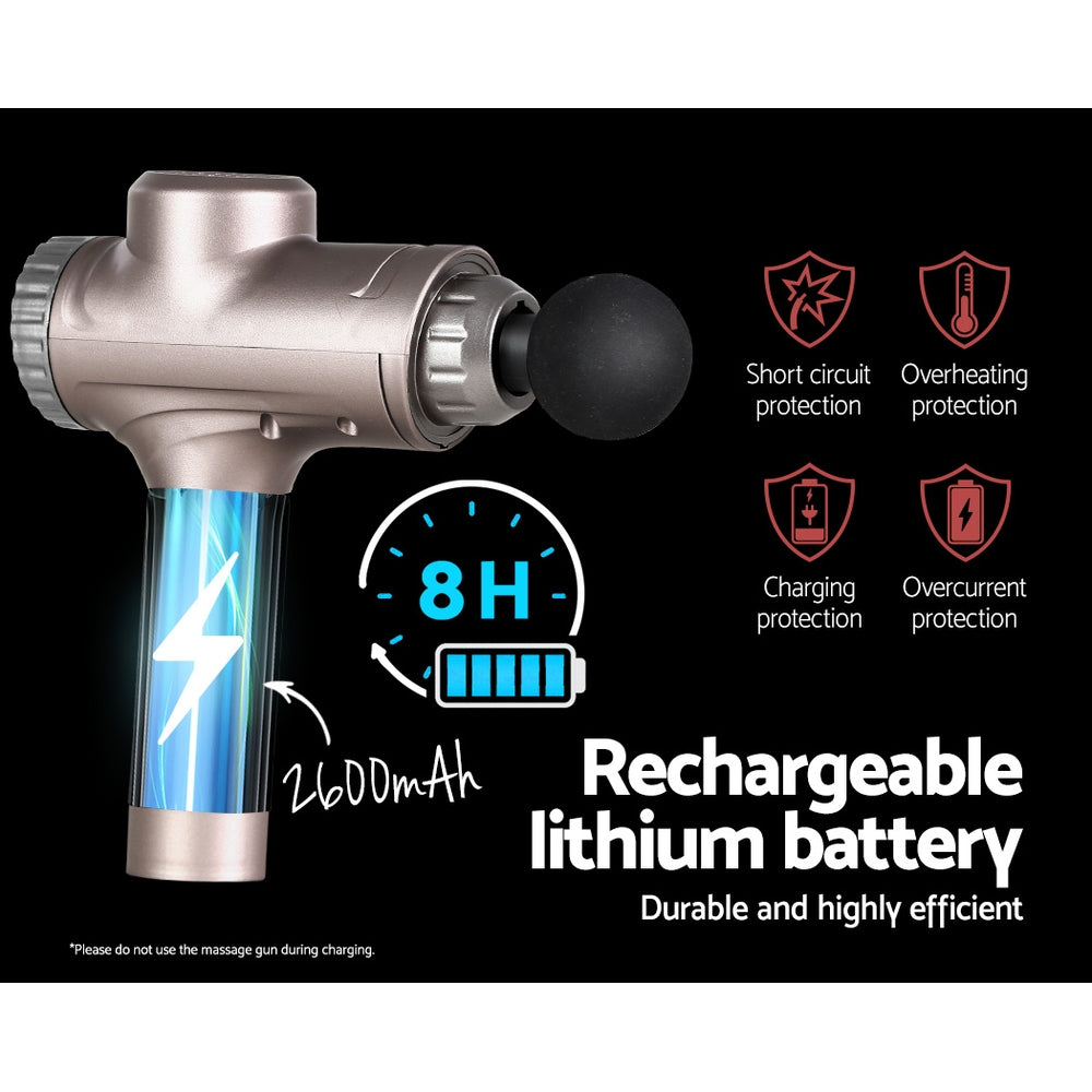 Chronic muscle pains? Hardcore gym junkie? Office job with long working hours? Recovering from an accident? Whatever your situation, our Everfit Percussion Massage Gun provides customised percussive relief in the comfort of your own home, without the need to visit luxury spas. The powerful 20V brushless high-torque motor with closed-loop control operates quietly and provides rapid bursts of pressure penetrating 12mm deep into your muscle tissues at up to 4000 percussions per minute. The massage gun is powered by a rechargeable lithium battery that lasts up to 8 hours so that you can forget to recharge once in a while and the non-slip rubber handle provides a comfortable grip to reduce hand fatigue. Percussion speed can be easily adjusted using the intuitive LCD display with smart touch controls and there are 30 speed levels to suit various purposes from simply waking up your muscles to relieving lactic acid and assisting muscle recovery after exercising, or even intense professional-level massages. And with the six interchangeable head attachments for targeted relief (round, fork, bullet, flat, Pneumatic and conical heads), you are ensured of a fully customised massage.