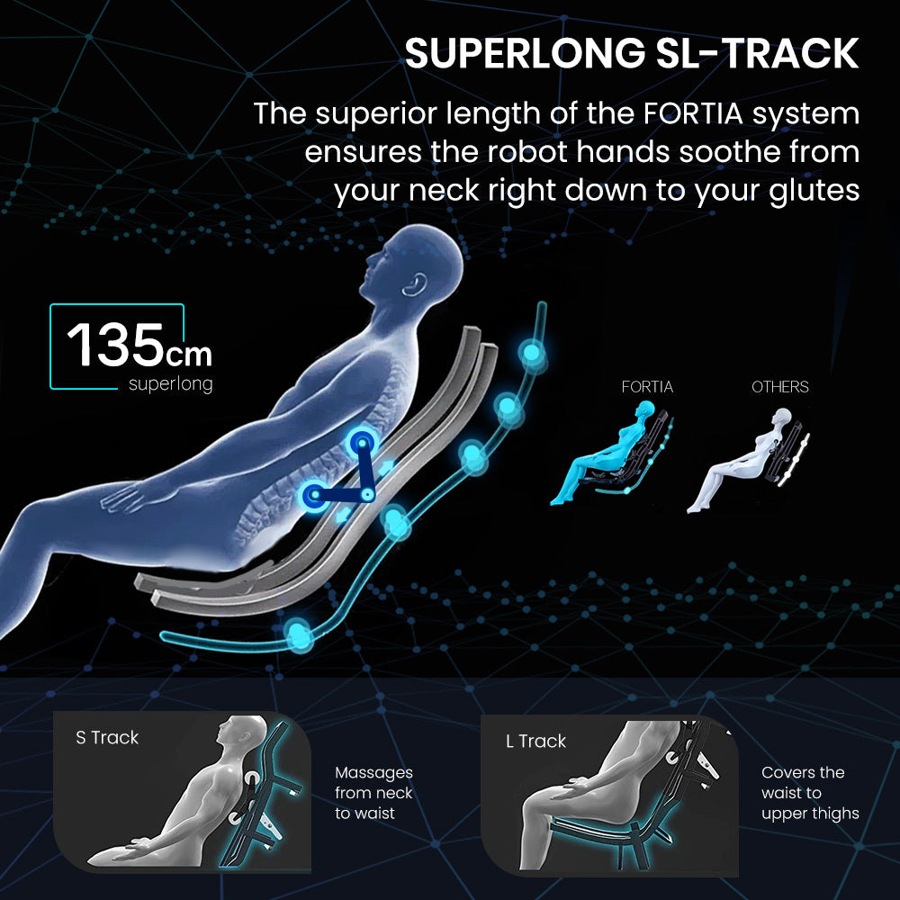 Unlike other models of the market that only offer an L-Track or a medium length SL-Track, the FORTIA offers a full length 135cm SL-Track. This ensures that the 4D Robo Hands progress all the way down from your neck to your glutes, giving you a revitalising massage which you can set to replicate your favourite massage technique.