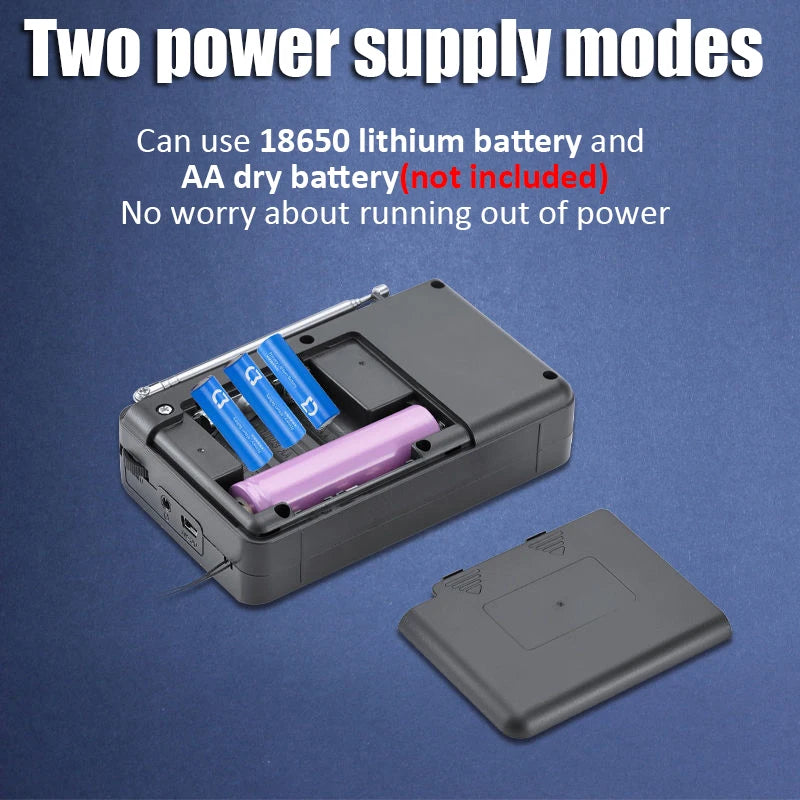 This portable radio supports multiple power sources, including a rechargeable 18650 battery or AA batteries, ensuring uninterrupted use wherever you go. With TF card and USB music playback, headphone support, and a convenient size, it’s perfect for daily listening, camping, or travel.