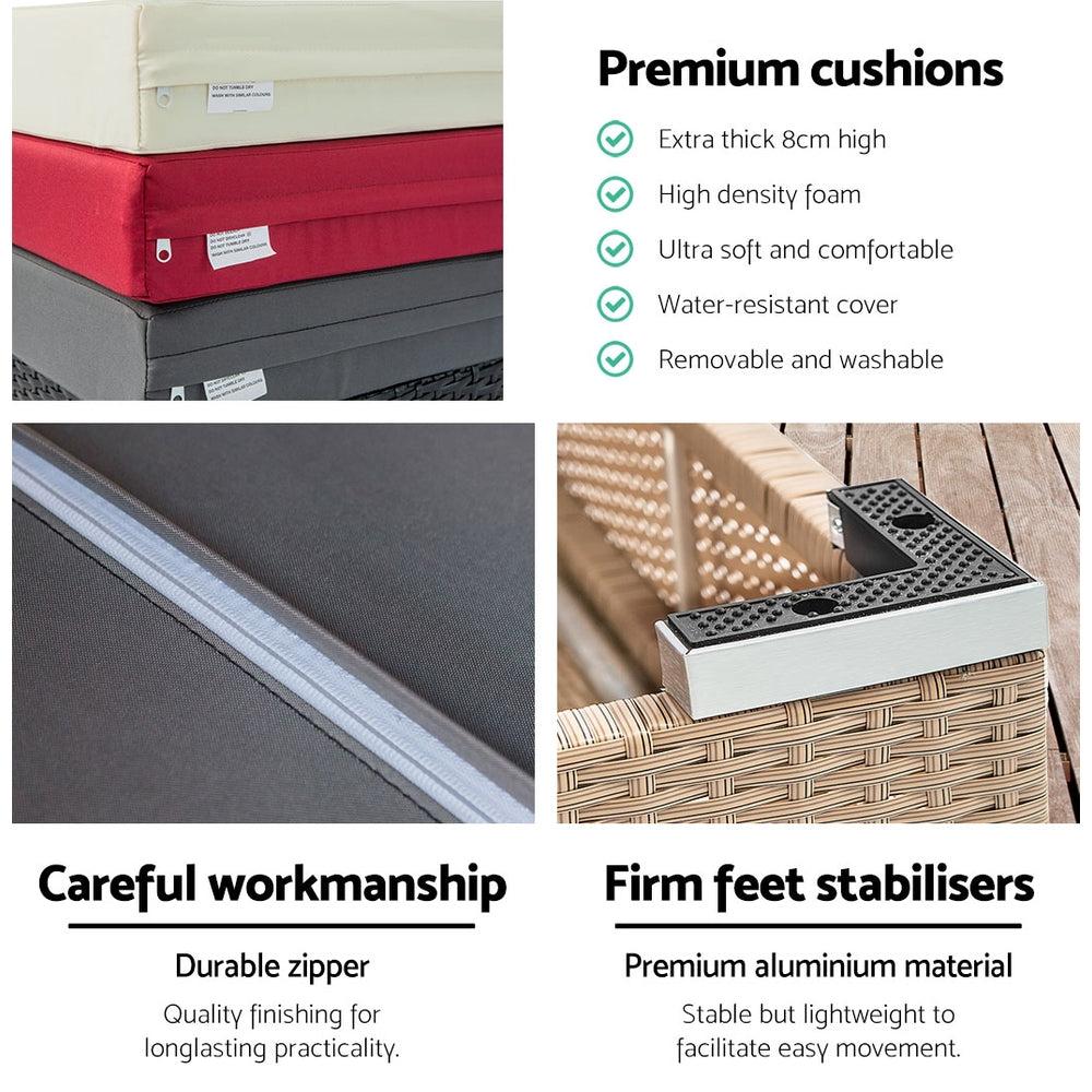 Time to give your backyard a complete make-over with our stylish yet affordable outdoor furniture set! It is made of heavy duty aluminium frame and UV resistant PE wicker, together with amazing designs, you won't be disappointed with the quality. The set comes with a square storage cube along with seat cushions padded in high density foam that has weather-resistant, UV resistant and tear -resistant covers. With the water -resistant covers included, you do not need to worry about storing them during rainy days anymore.