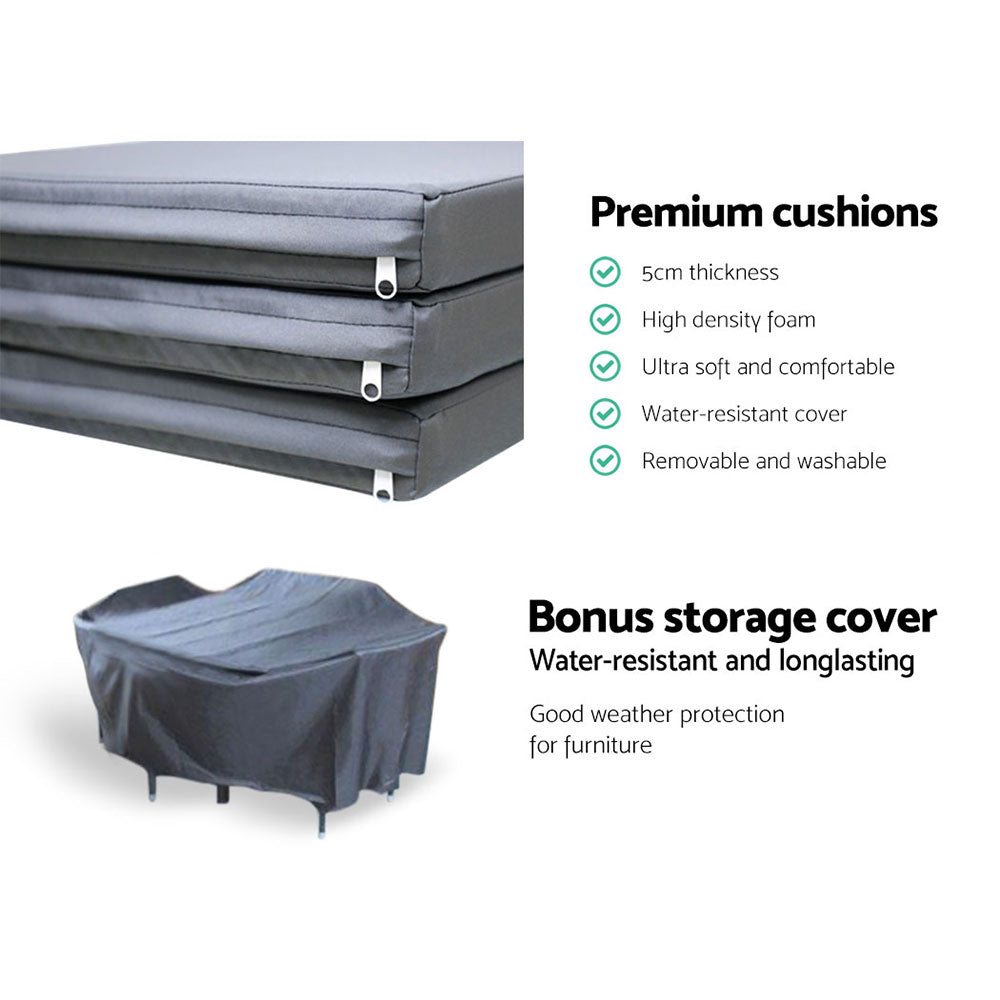 Dine in exquisite style with our elegant Gardeon Outdoor Dining Set. Finished in UV-resistant PE rattan with a strong and sturdy aluminium frame construction for both chairs and table, this multi-piece dining set is designed to please as well as stand up to the weather elements. The chairs have a sleek and contoured profile with 5cm thick high density foam cushions to ensure comfort and style are always in place. And the spacious dining table features a 5mm thick tempered glass top for safe and hardy use. Not least, a water-resistant cover for the entire ensemble is also included to keep it clean always.