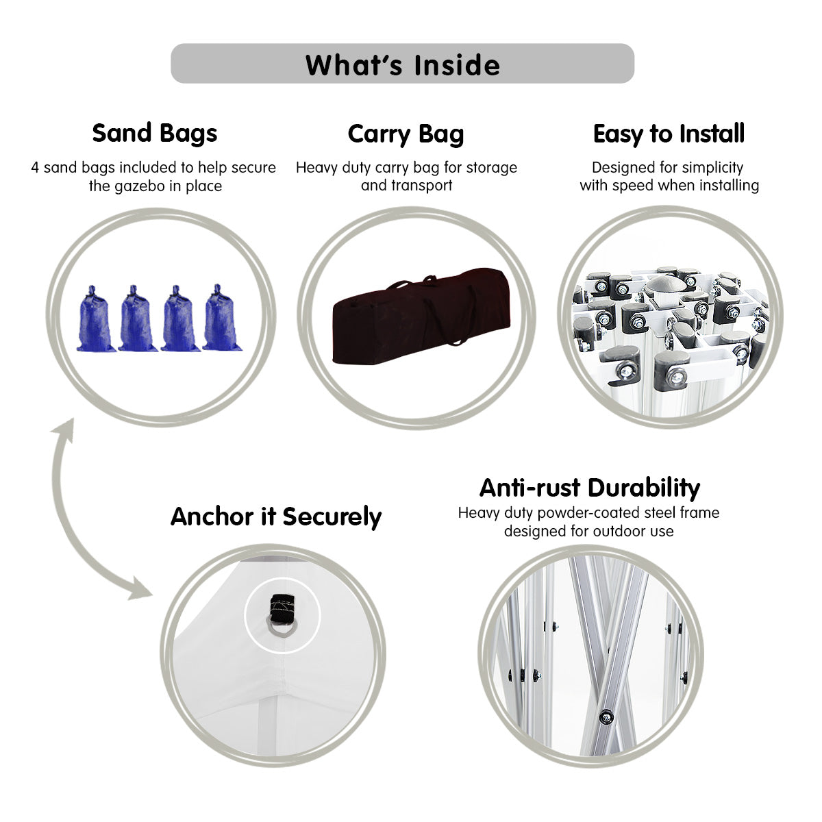 As well as the main unit and 5 walls this combo pack also comes with a handy carry bag and sandbags to help secure your marquee. And to make things a little easier our quality marquees are fitted with nylon inserts in the frame which eliminates frame jamming often experienced when erecting cheaper units.