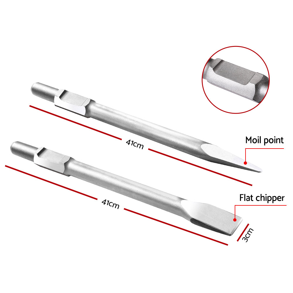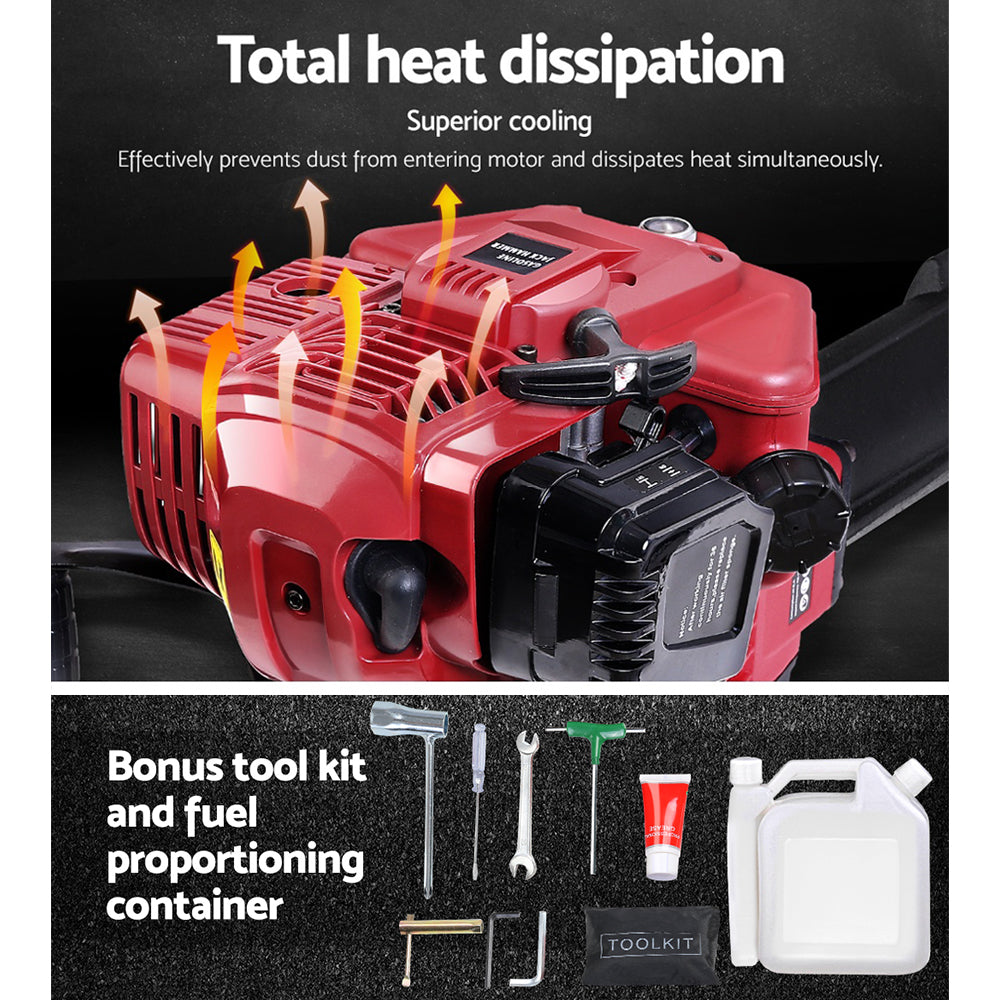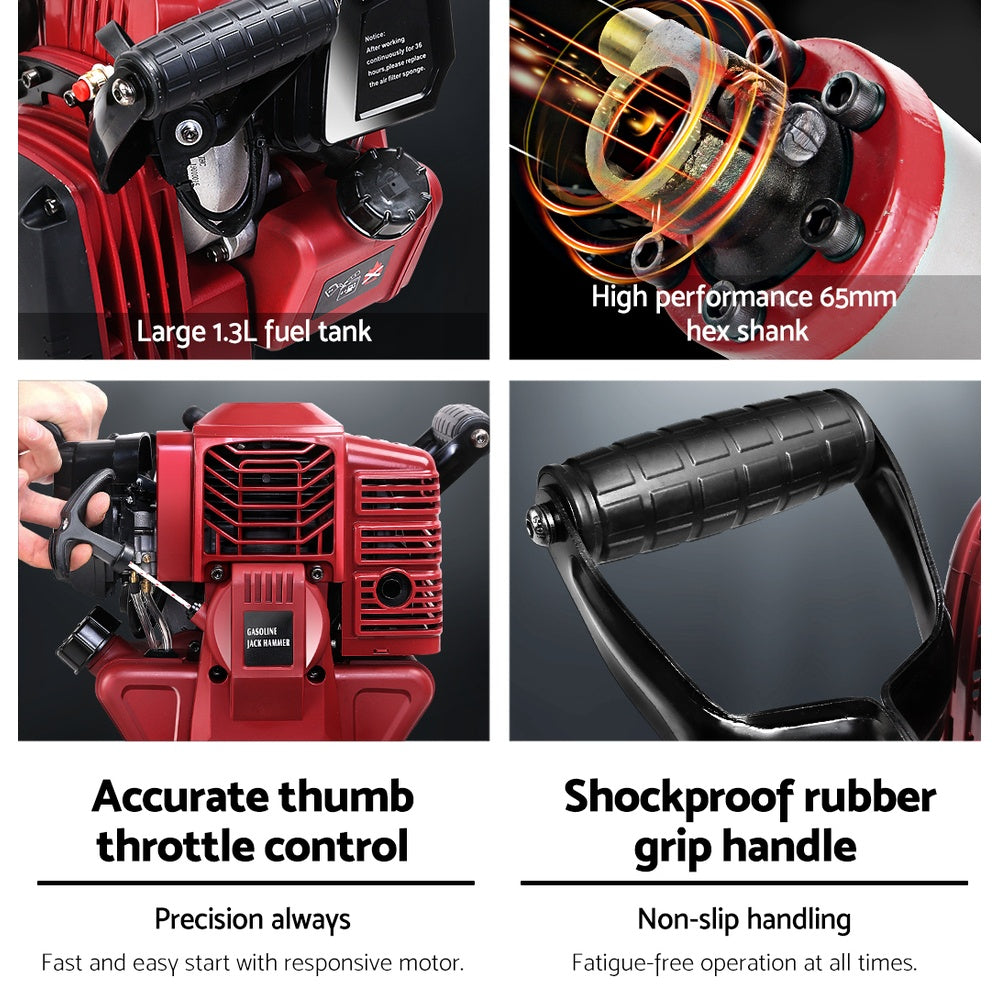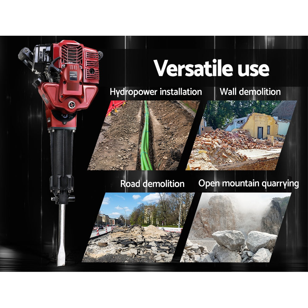 Break easy with the Giantz Petrol Jackhammer. Designed to take care of even the hardest surfaces, our jackhammer comprises a powerful and efficient 52cc air-cooled, 2-stroke motor specified with toughened and hardy components. It also provides good heat dissipation to keep you cool on the job. The accurate thumb throttle control ensures precise speed with an easy-start hand-pull system while the shockproof hand grip provides for fatigue-free operation even with prolonged use. Better still, the jackhammer is perfect for a variety of uses including hydropower works, road and wall demolition as well as open mountain quarry operations. Not least, the jackhammer comes with a host of bonus accessories including a bonus Moil point chisel, tool kit and oil proportioning container for hassle-free use.