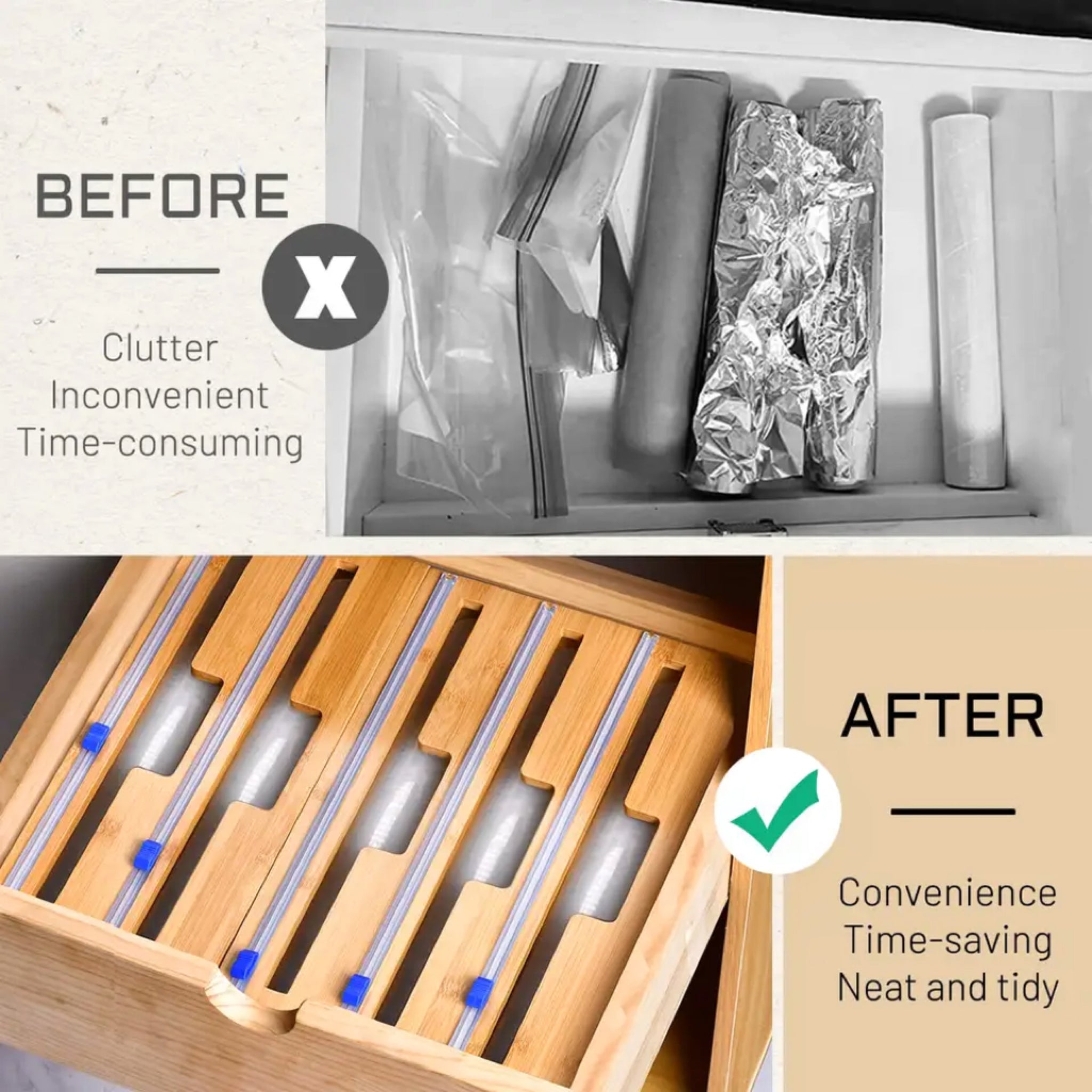 BOX IT UP, SORT IT OUT, HANG IT UP: Say goodbye to clutter and hello to organization with the GOMINIMO 3-in-1 Bamboo Wrap Dispenser. It has three slots for different types of wraps, so you can store and sort them easily and conveniently. You can also mount it on the wall to free up some space and grab your wraps in a snap.