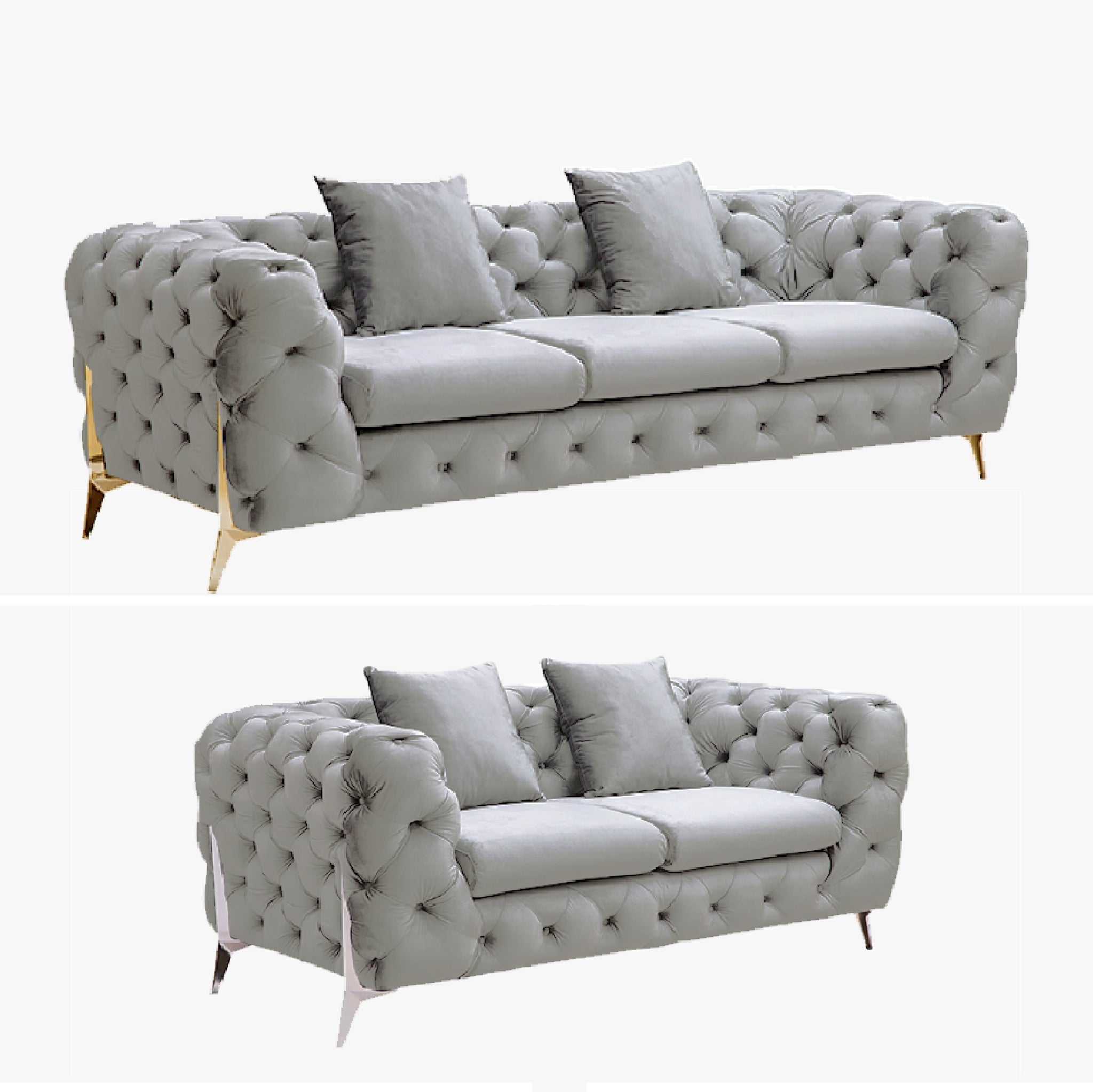 NNEDSZ Grand Tufted Lounge - Light Grey Velvet - Silver Legs
