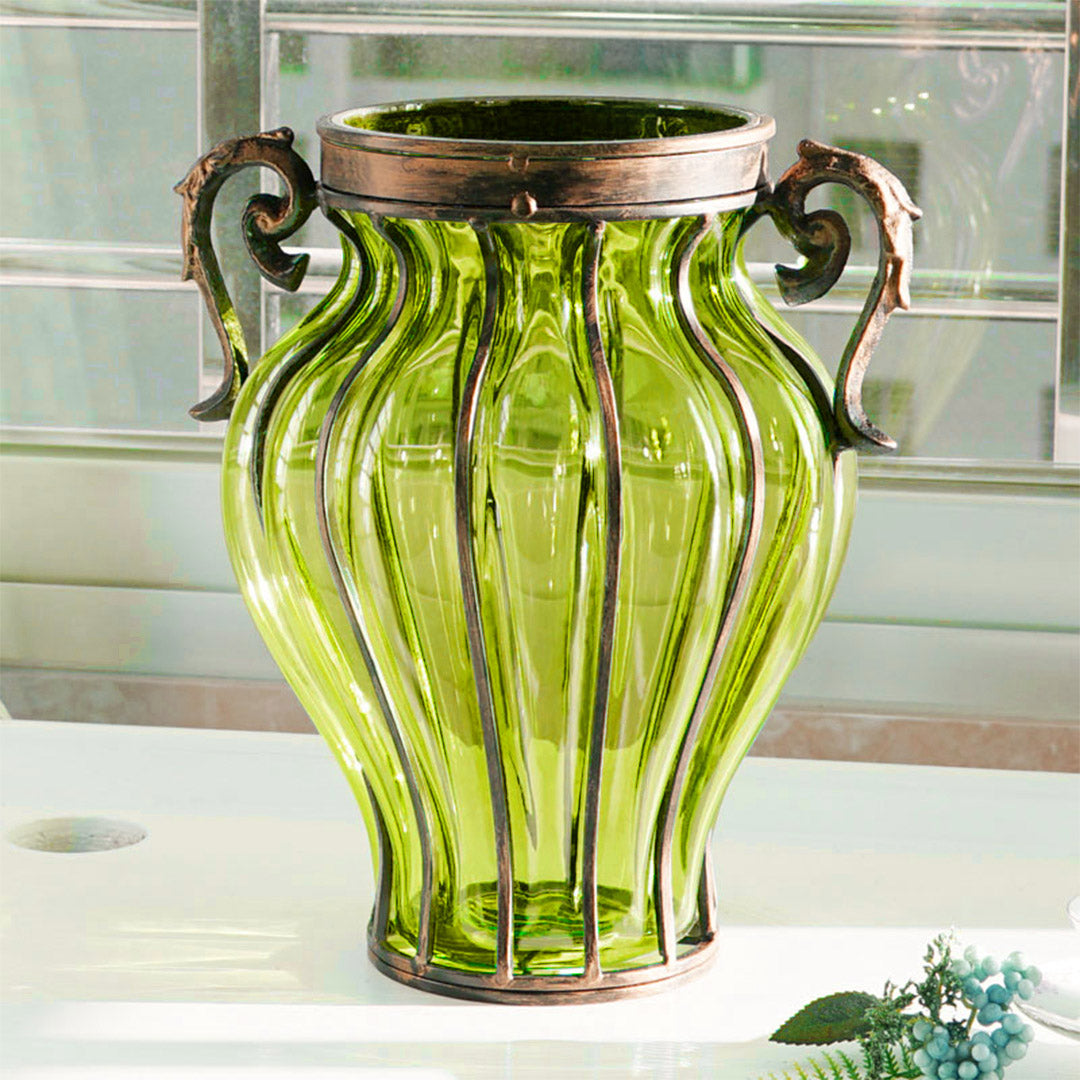 NNEAGS Green Colored Glass Flower Vase with 4 Bunch 9 Heads Artificial Fake Silk Rose Home Decor Set