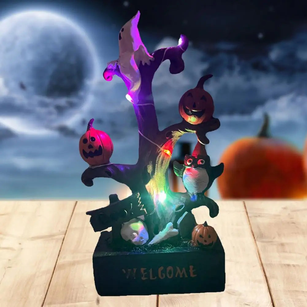 Elevate your Halloween spirit with this enchanting pumpkin ghost tree LED light statue. Perfect for indoor and garden decor, this resin ornament adds a magical touch to any setting.