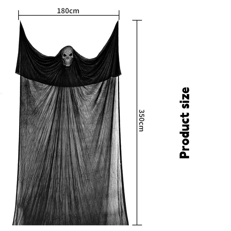 Description: Create a spine-chilling atmosphere this Halloween with our Hanging Skull Ghost with LED Sound. Made from lightweight polyester and featuring a detailed PVC skull, this ghost is perfect for decorating haunted houses, porches, yards, and party venues. The built-in LED lights and spooky sound effects bring this ghost to life, making it a must-have for Halloween festivities. Easily hang it from trees, walls, or ceilings using the attached fish thread to instantly transform your space into a spooky spectacle. Perfect for both indoor and outdoor use, this ghost decoration will take your Halloween decor to the next level!