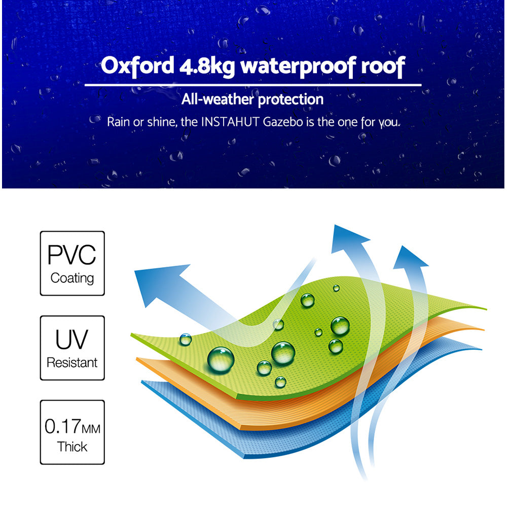 Featuring high density, long lasting PVC coated oxford fabric with effective UV and water repellent treatments, this INSTAHUT 3X4.5m Pop Up Gazebo provides a lovely ground and canopy coverage of 300 x 450cm. It is perfect for all your upcoming outdoor activities, as a sunshade station as well as a shelter for unexpected rains.
