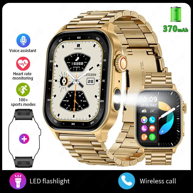 Stay connected, track your health, and shine in every move with the 2.01β HD Display Smart Watch β elegant gold steel design, Bluetooth calling, and all-day wellness tracking in one.