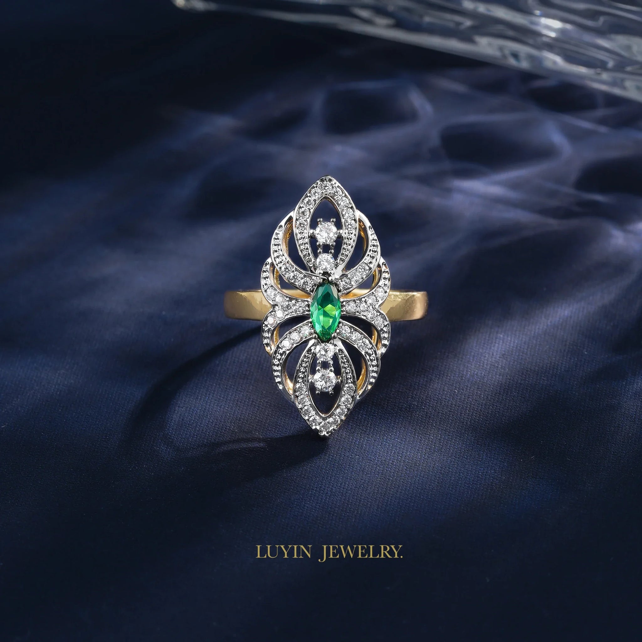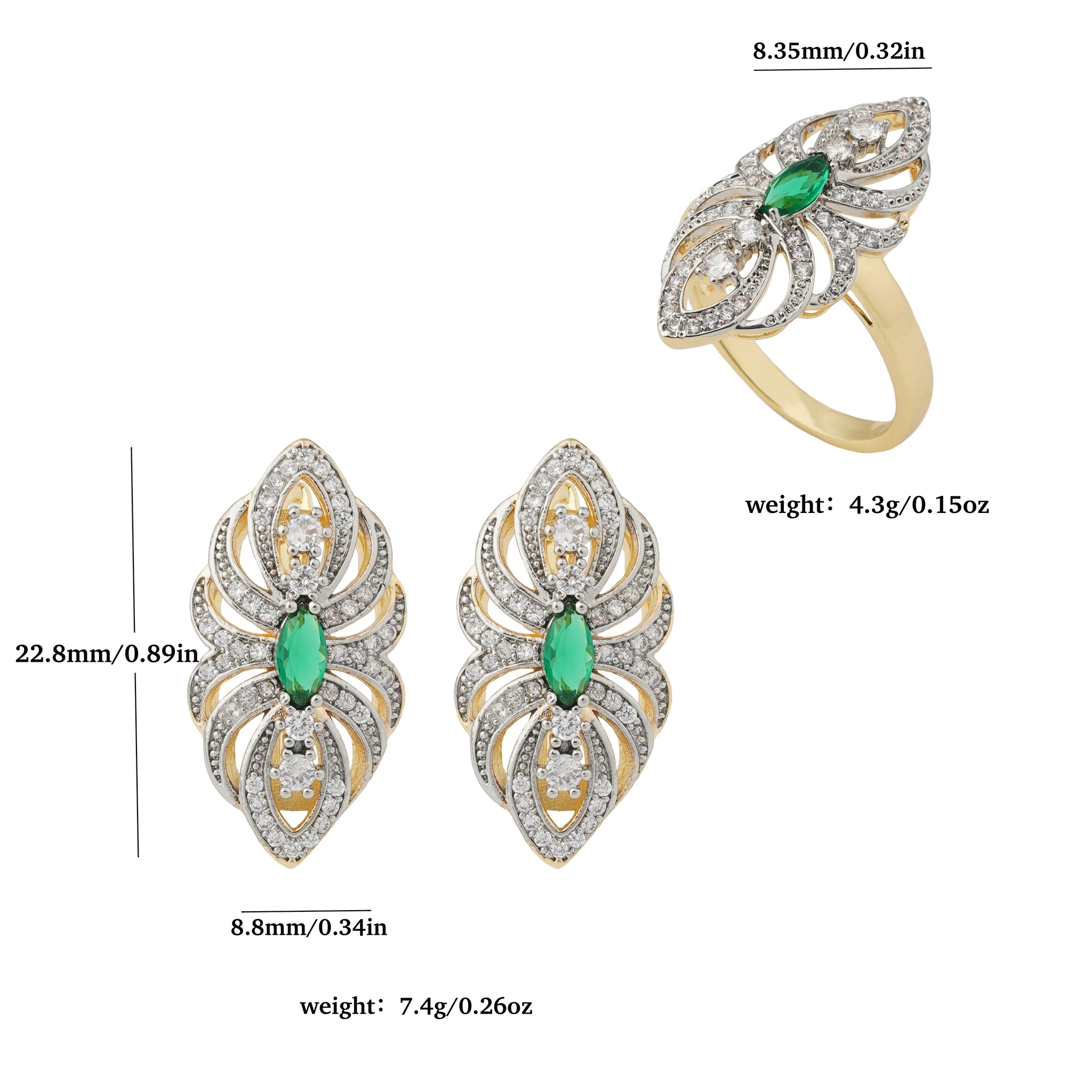 The Bohemian Ring and Earring Set is crafted from copper plated with 14K gold and inlaid with sparkling cubic zirconia. Designed for women who love expressive yet elegant fashion, this set is ideal for parties, weddings, engagements, and anniversary celebrations. With a green-toned main stone and vintage style, the set complements a wide range of outfits.