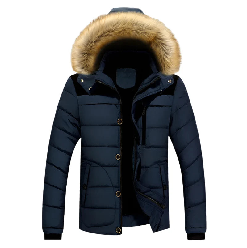 The Men's Thick Hooded Winter Parka Jacket is built to keep you warm and protected during colder seasons. Featuring a cotton and polyester construction with thick cotton filling, this coat ensures insulation and comfort in both casual and outdoor settings. The full-zip closure, attached hood with fur lining, and regular length design make it ideal for autumn and winter wear.